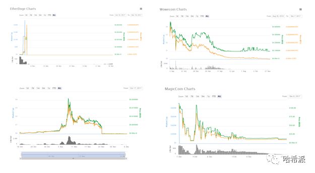 另外,价格暴涨后便近乎归零的数字货币也有不少,比如 EtherDoge、PeopleCoin。据不完全统计,这类币种的数量多达三百多。