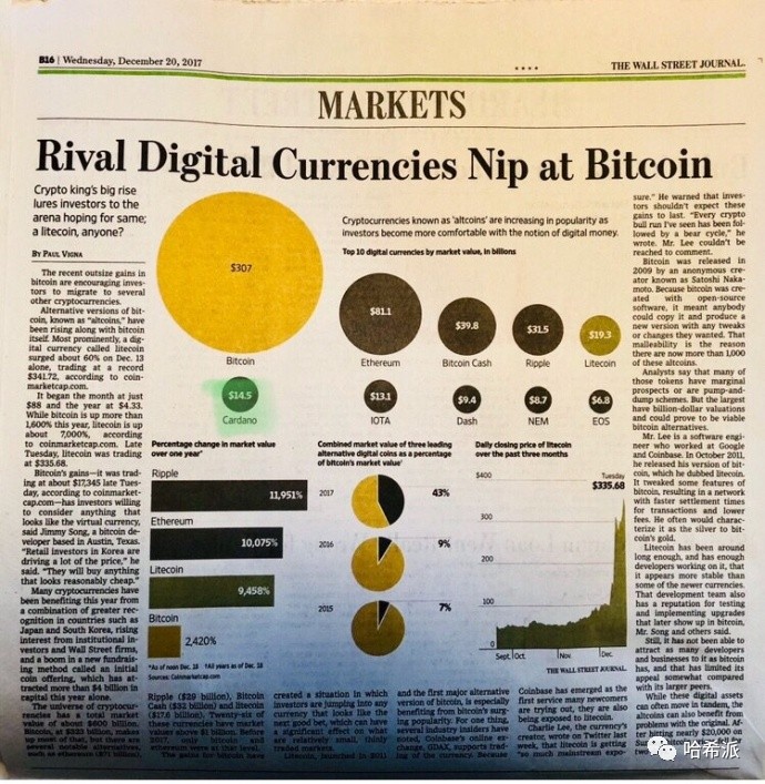 而到了 2017 年,尤其是后半段的时候,比特币、ICO 这些与数字货币领域相关的字眼开始频繁“登陆”各国主流媒体,比如彭博社、CNBC、央视财经、福布斯、华尔街日报、韩联社、日本财经、纽约时报等等。据不完全统计,CNBC 2017 年 12 月对于关于比特币的相关报道,已经是 2016 年全年的 6 倍之多。到了 2017 年 12 月 20 日,华尔街日报还用了一整个版面来介绍数字加密货币,讨论目前比特币以及它的“竞争对手们”。