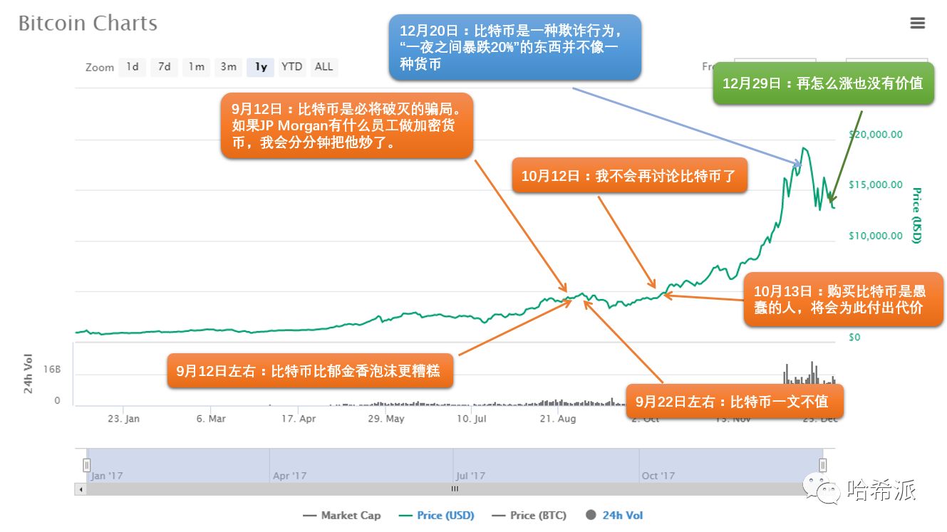 据了解,近期正考虑向用户提供芝商所比特币期货产品的 JP 摩根以及计划推出比特币等加密货币做市服务的高盛,其 CEO 都曾公开批评比特币——就在 2017 年后半段,JP 摩根 CEO 杰米·戴蒙在接受访问时,多次批评比特币;而高盛 CEO Llyod Blankfein 则在 12 月第 4 周比特币价格下滑 30%以上之后表示,比特币是一种欺诈行为,“一夜之间暴跌的东西并不像是一种货币”。
