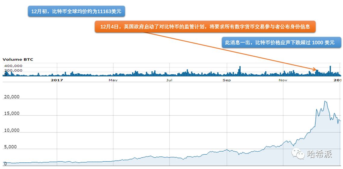 2017 年 9 月 8 日:中国媒体传出将关闭比特币交易平台的信息之后,比特币价格应声下跌逾 20%。随后 9 月 14 日,正式公告下达之后,比特币价格再次下滑近 20%;