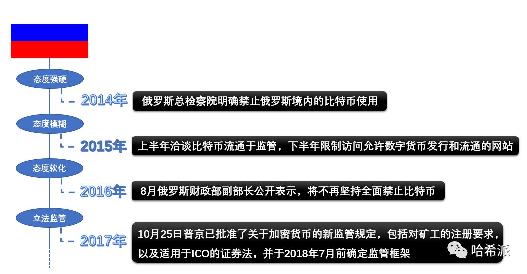 从 2014 年的全面禁止到 2017 年的立法规管,俄罗斯对于比特币的监管态度已逐渐放软。去年 8 月俄罗斯政府宣布全面支持数字货币挖矿业、11 月于海参崴建立加密货币试点咨询机构……步入 2017 年以来,俄罗斯发布了多项激励数字货币市场发展的政策,并表示将于 2018 年 7 月之前,明确加密货币、ICO 以及智能合约的定义和地位。不过,从俄罗斯发布“加密卢布”以及与以太坊的合作等等来看,相较于促进自由开放交易市场,俄罗斯似乎更想从国有层面控制数字货币技术的发展。