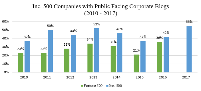 博客使用连续三年增长,目前有55%的Inc. 500强企业使用,而且Inc. 500强企业比Fortune 500更喜欢使用博客。
