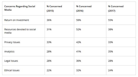 使用社交媒体的前两个关注点是投资回报、时间分配和专用于社交媒体的资源。 最大的好处是建立品牌知名度,而最低收益则是产生潜在客户/销售额。