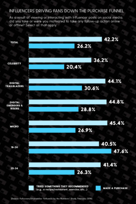 意见领袖在迅速推动他们的追随者进入购买渠道。大约42%的受影响者在接触到品牌内容后试图推荐这些产品或服务,26%的受访者购买了产品。