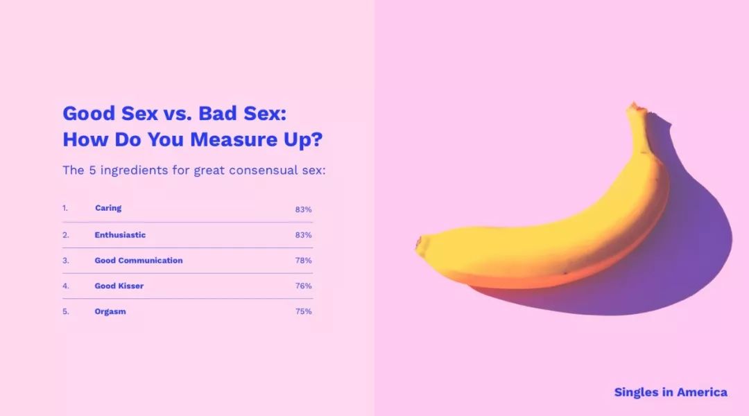 满意的性爱:83%的单身人士认为一个关爱伴侣和富有激情的伴侣是满意性爱的最重要因素,然后是沟通(78%),接吻技巧一流(76%),达到高潮(75%)。