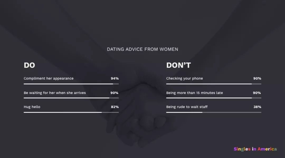 女性认为在首次约会中什么是合适的:94%的女性希望她们的约会对象能够赞美他们的衣着,90%的人希望约会对象能够提前等待她到达,82%的人希望约会对象能够拥抱她,71%期望可以亲吻脸颊,91%的人认可对象支付账单,45%的人认为AA分账也是可以接受的。