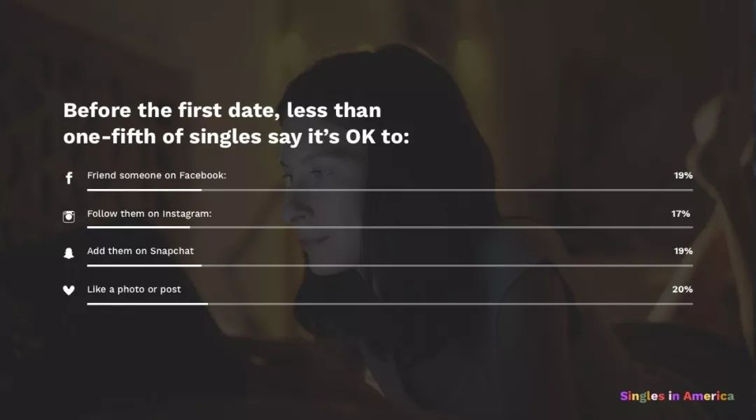 - 正式约会前,建立界限:不到1/5的人认为在Facebook上相互关注是OK的(19%),其次是相互关注Instagram(17%),关注Snapchat(19%),或者在约会前对照片和文章点赞(20%)