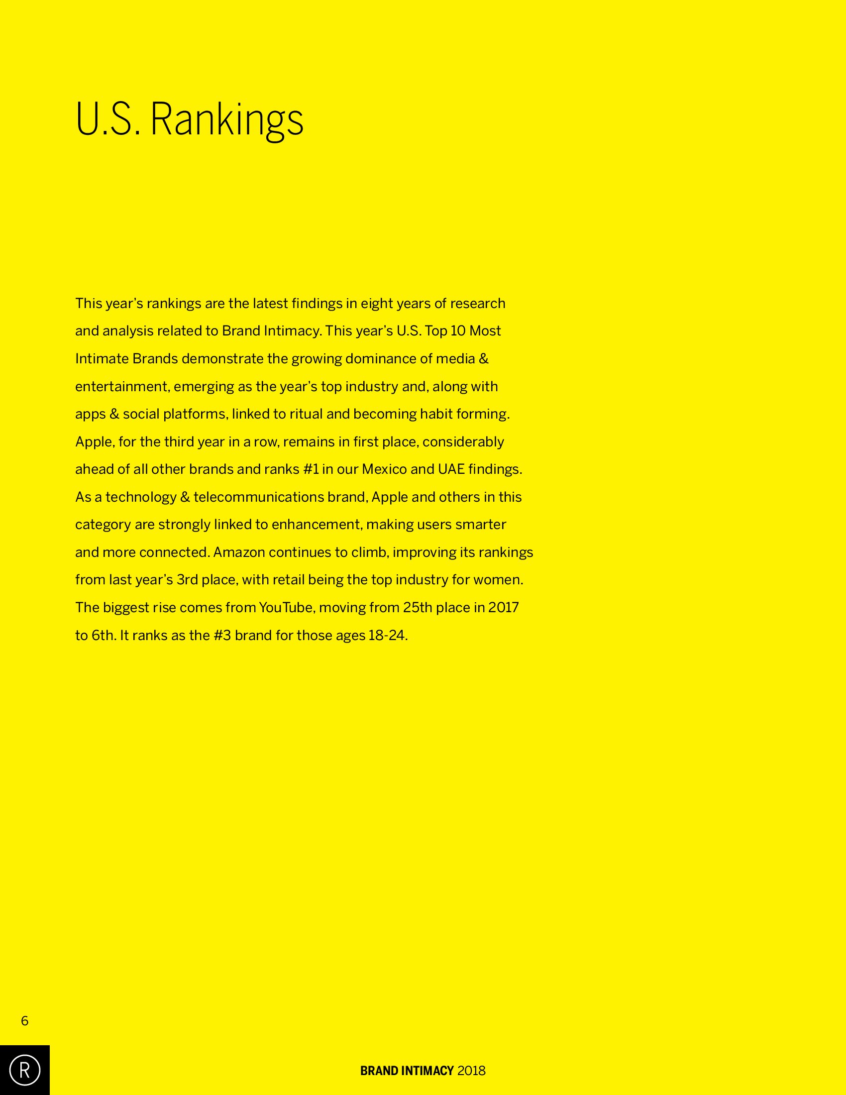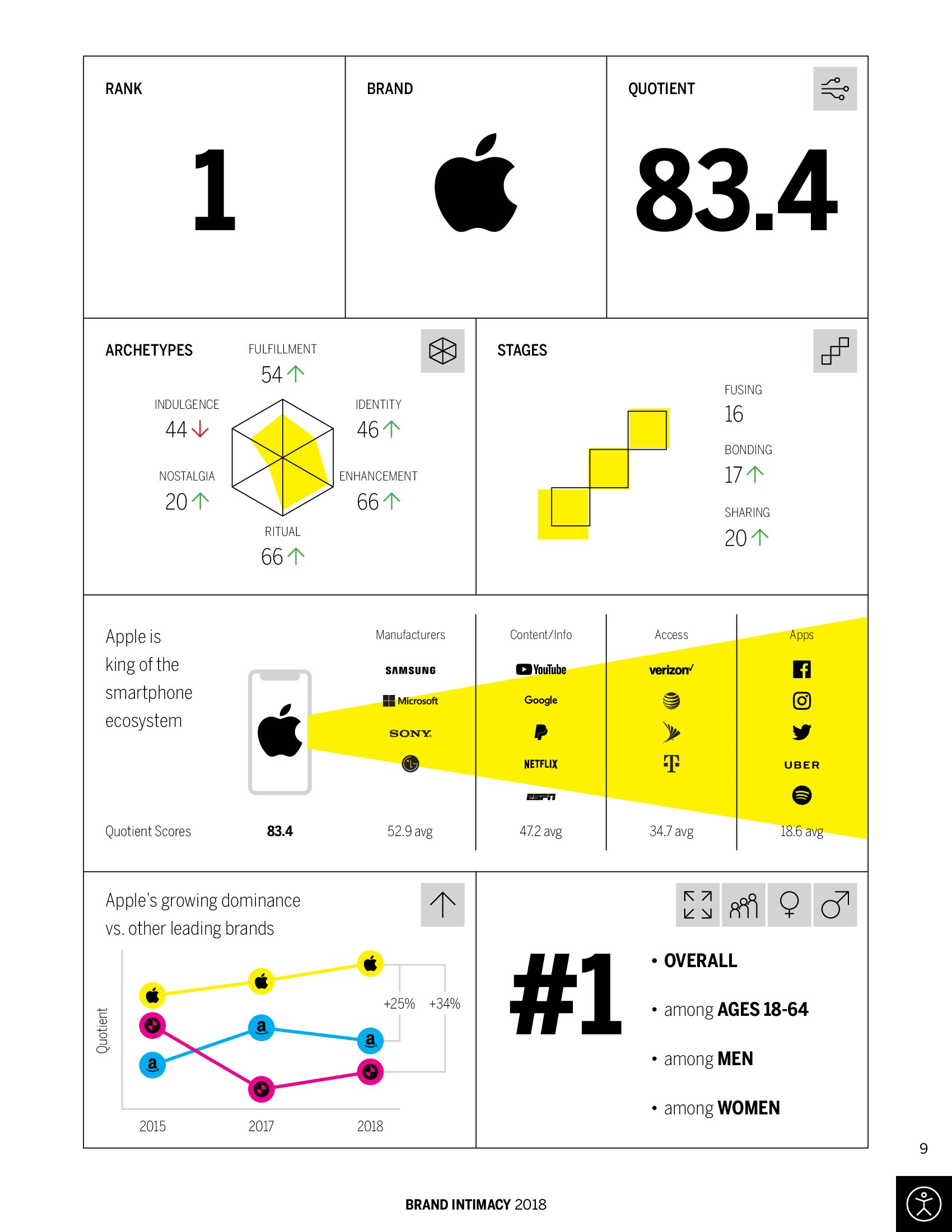 苹果公司成为明确的领导者,远远领先于其他品牌。苹果的亲密度是83.4分,比排在第二位的亚马逊(66.5)高近20分。