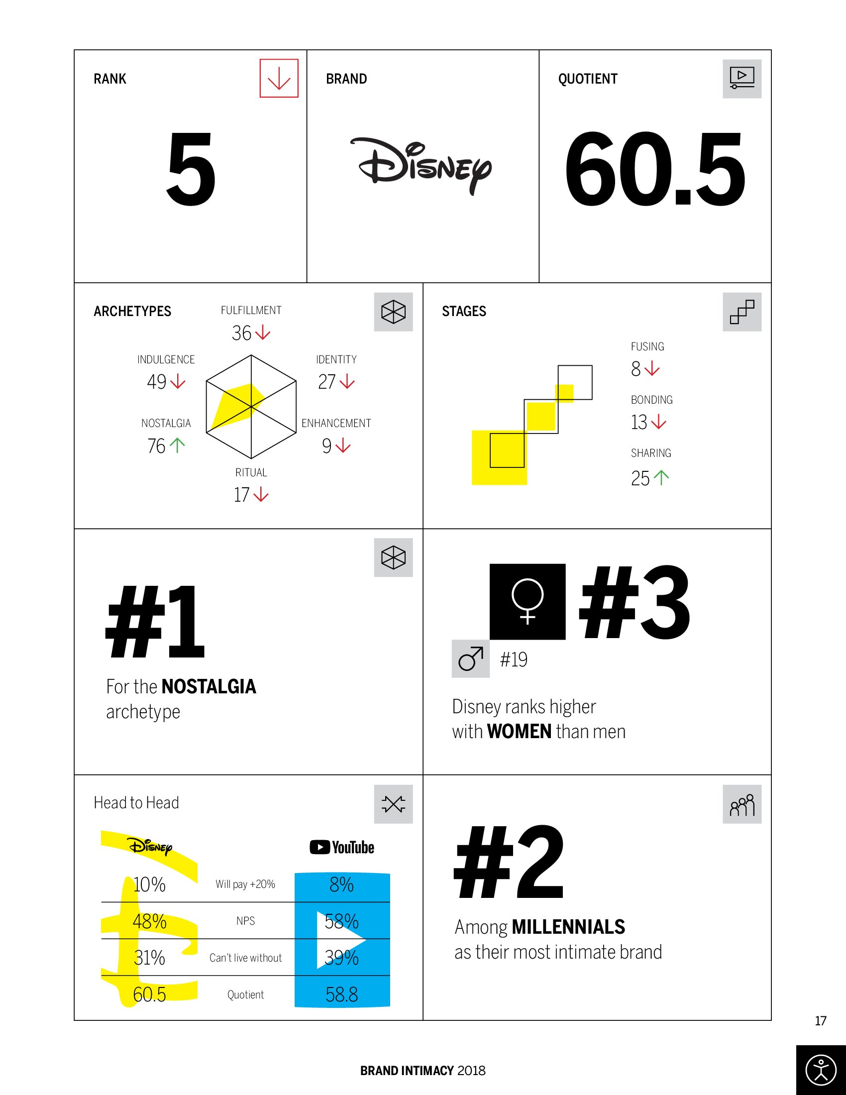 迪斯尼排在第五名,在女性中排名也高于男性,并且在怀旧方面排在首位,它在千禧一代消费者中排在第二位。