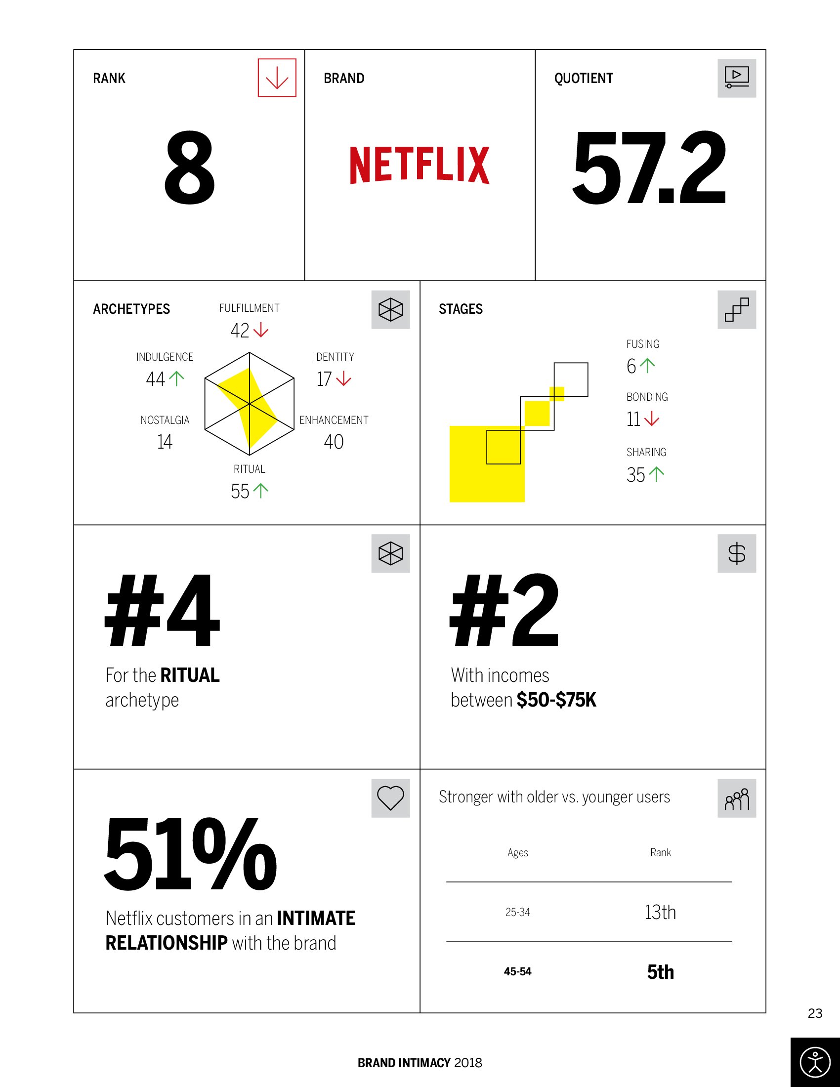 Netflix在亲密度方面排名第八,在收入5-7.5万美元的美国人中排在第二位,Netflix是女性消费者最关注的五大品牌之一;