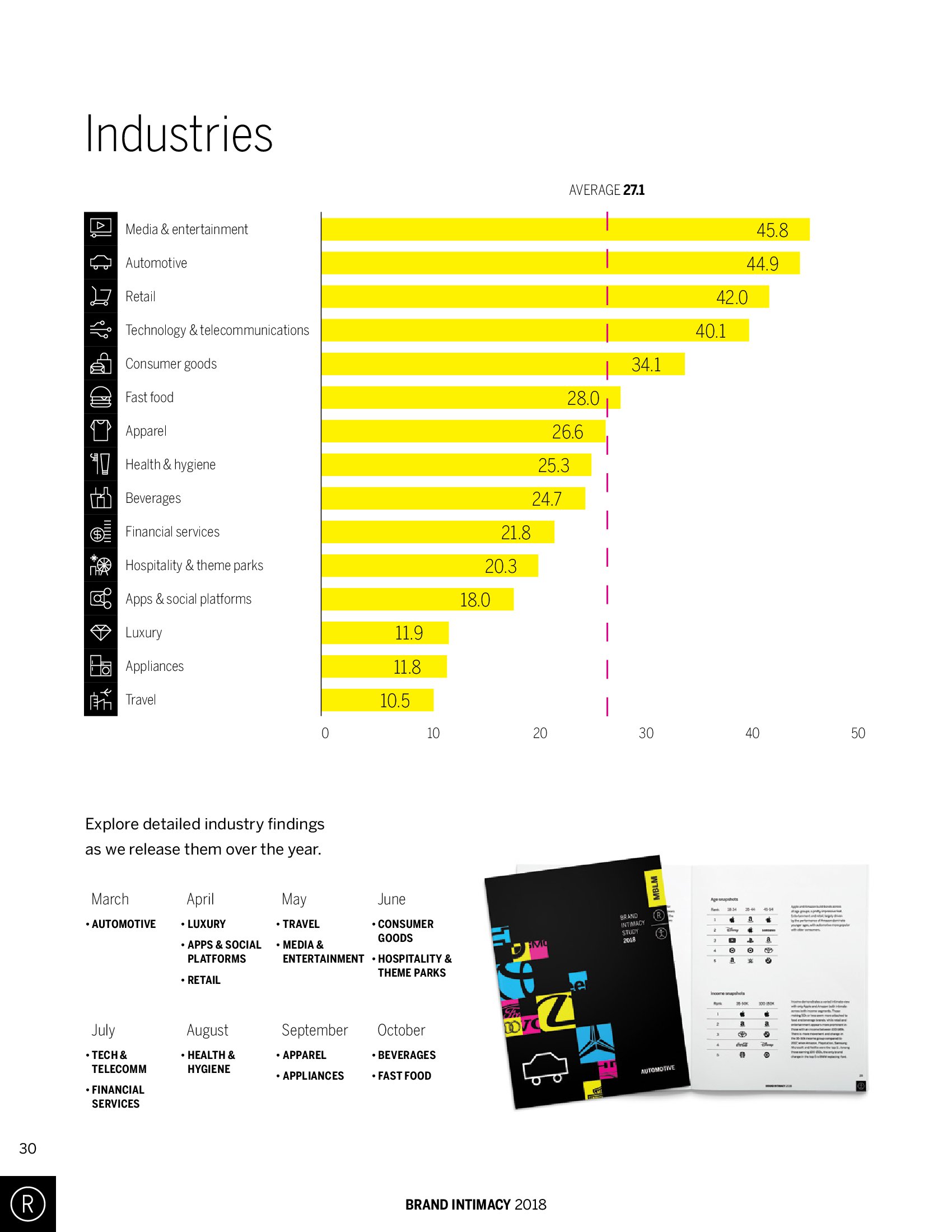 媒体和娱乐品牌的平均亲密度最高,其次是汽车、零售和技术及电信品牌。