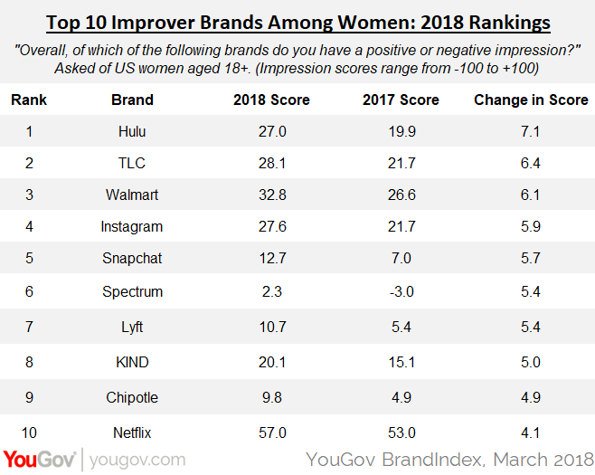 根据YouGov的新调查,在女性消费者中的十佳品牌榜新近两家企业:Hershey排在第六位和Netflix排第9。