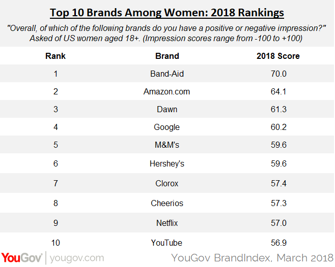Band-Aid、亚马逊、Dawn和谷歌保持与一年前相同的地位。