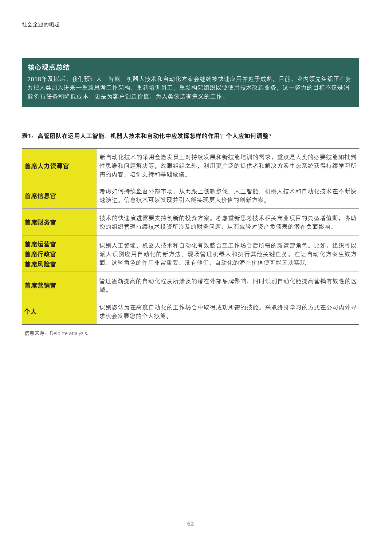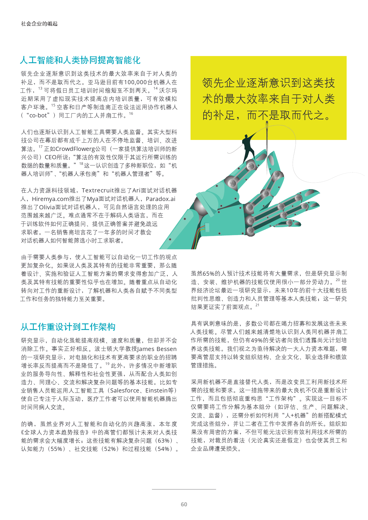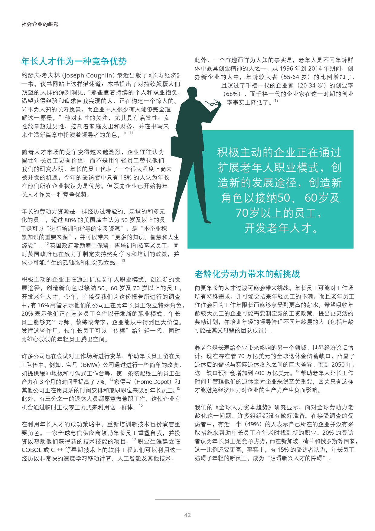 报告指出,企业在关注自动化、新技术需求、劳动力老龄化和劳动市场日益紧缩的同时,还须重新调整高管团队,以专注应对企业不断演变的社会角色,这是关乎企业成败的重大关键。在当下的新时代,人力资本与社会资本密不可分。这一现实要求组织于如何与当今时代开展业务,以及如何为未来的人力资本挑战做好准备两方面中,找到一个基本支点。