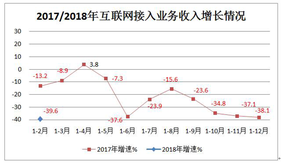 1-2月,互联网企业完成互联网接入业务收入60.2亿元,同比下降39.6%。