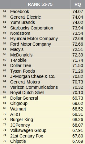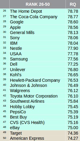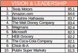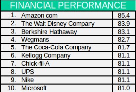 亚马逊(85.4)在这里依然成为毫无争论的领导者。虽然人们预料会有很多科技公司进入这个榜单,但是取而代之的是特迪斯尼(83.9)和Berkshire Hathaway(83.1)。微软(81)排名第十。