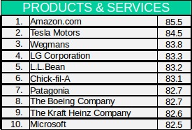 亚马逊以85.5的高分领先,其次是特斯拉汽车(84.5)和Wegmans(83.8)。微软(82.5)是另一家进入产品和服务前十名的科技公司。