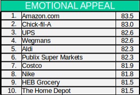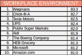 亚马逊(83.5)在这方面的表现也很优秀,其他领袖企业基本都来自食品和杂货行业,如Chick-fil-A(83)、UPS(82.6)、Wegmans(82.6)、Aldi(82.3)和Publix(82.3),Costco和HEB Grocery也位居前十。