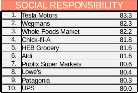 有趣的是,特斯拉(83.3)在这方面处于领先地位,其次是Wegmans(82.3)和Whole Foods Market(82.2)。遗憾的是没有任何一家科技公司在社会责任方面进入前十榜单。