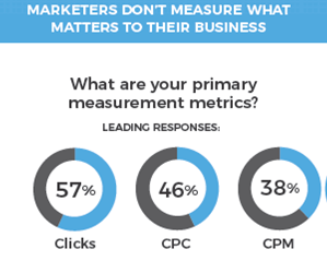 最后,看起来广告客户很大程度上将点击量视为广告成功的最重要指标,尽管点击数据经常被广告流量欺诈所扭曲。57%的广告客户将点击量描述为最重要的指标,其次是每次点击的费用(46%)和每千次点击成本(38%)。