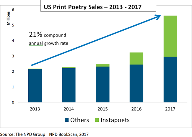 诗歌在社交媒体上越来越受欢迎,这推动了美国诗歌图书销售的复苏。事实上,根据全球信息公司The NPD Group的统计,2017年排名前20位的畅销诗歌作家中有12位是“Instapoets”,他们将原创诗歌与图像相结合,在Instagram、Twitter、Tumblr和其他社交媒体平台上创建高度共享的帖子。去年在美国出售的近一半的诗歌类书籍是由Instapoets撰写的(47%)。除Instapoets的增长外,美国诗歌类书籍自2015年以来以每年21%的复合增长率增长,成为发行速度最快的类别之一。
