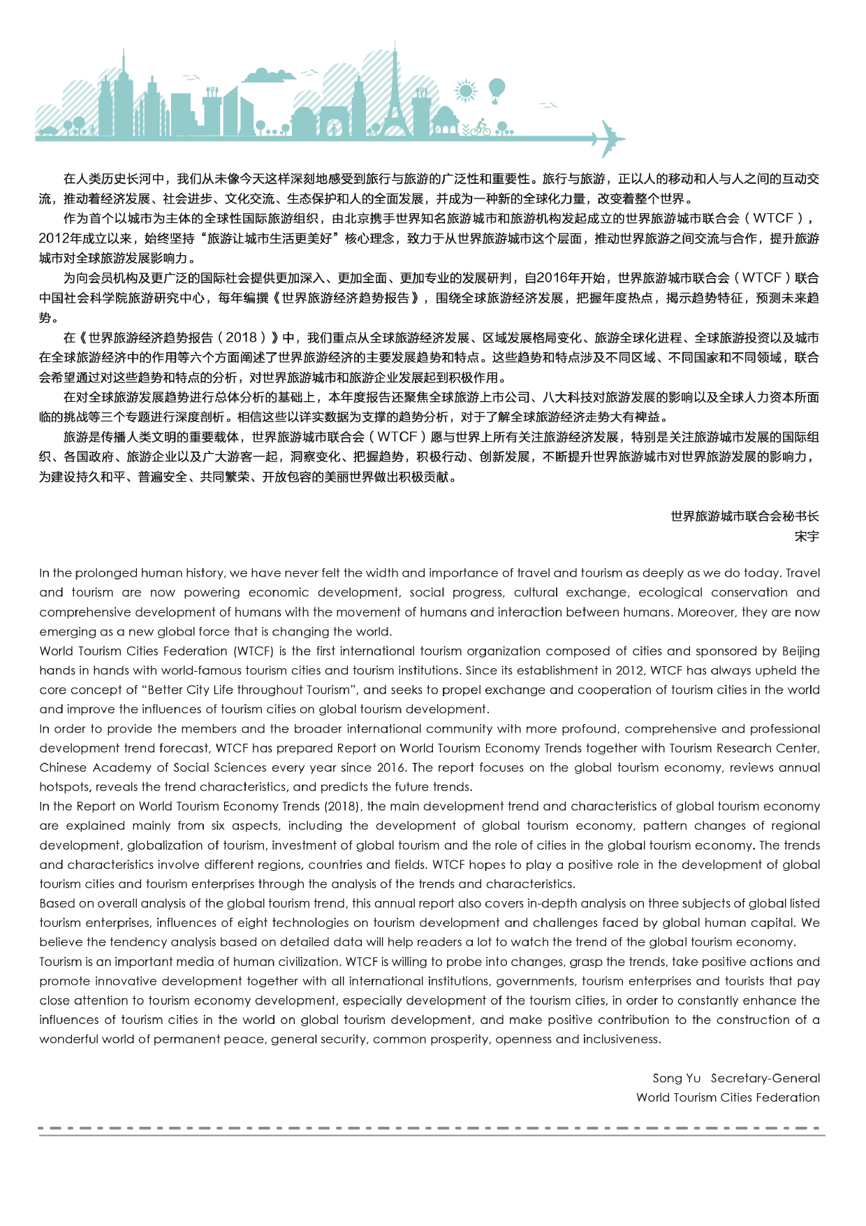 预测旅游经济的发展趋势,解释全球旅游经济发展年度特征,《世界旅游经济趋势报告(2018)》是联合会提供的又一份智力成果。世界旅游城市联合会愿与世界上所有关注旅游经济、关注城市发展的政府、机构、企业、个人一起,洞察变化,把握趋势,积极行动,共同促进世界旅游的可持续发展,共同建设持久和平、普遍安全、共同繁荣、开放包容、清洁美丽的世界。