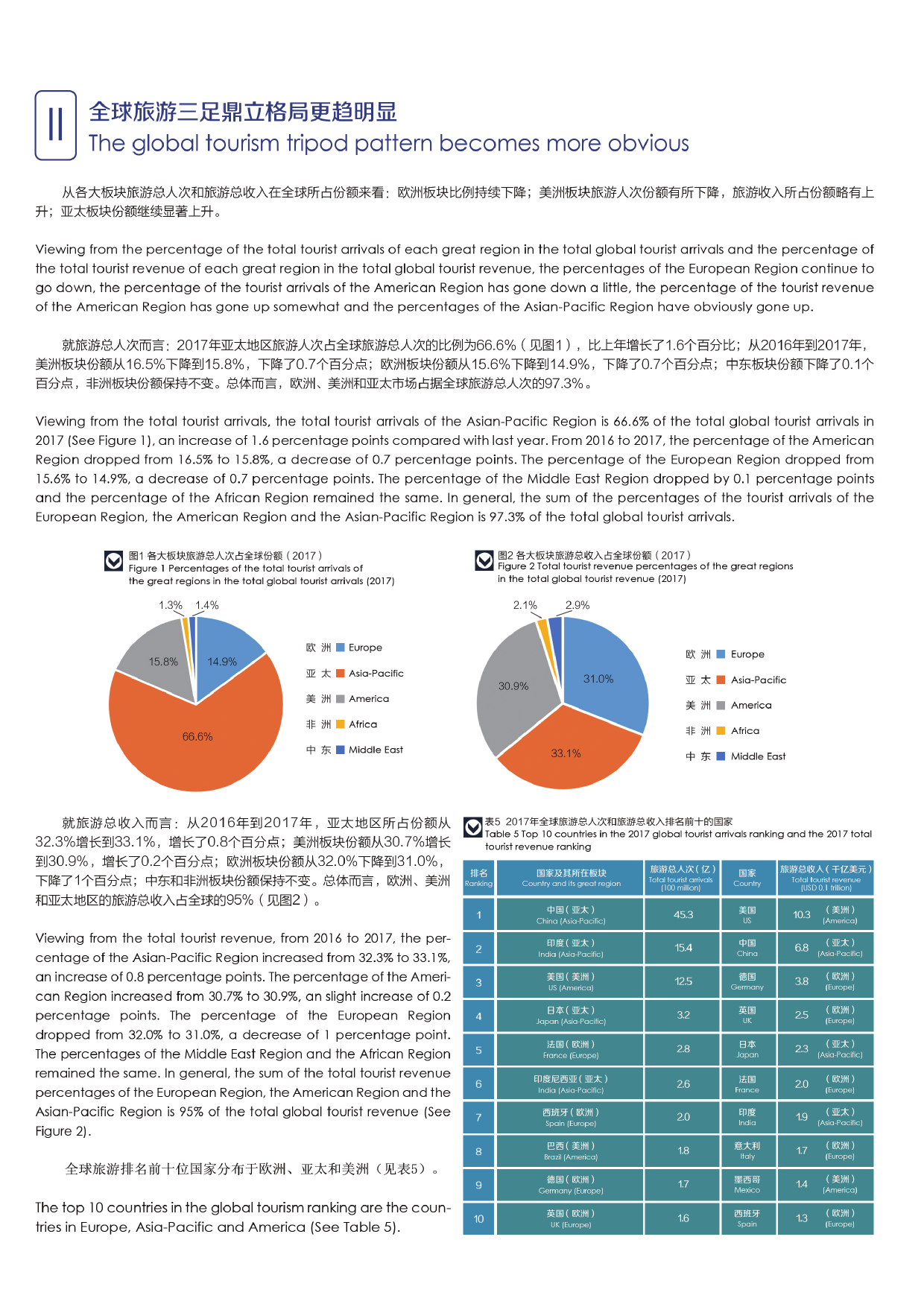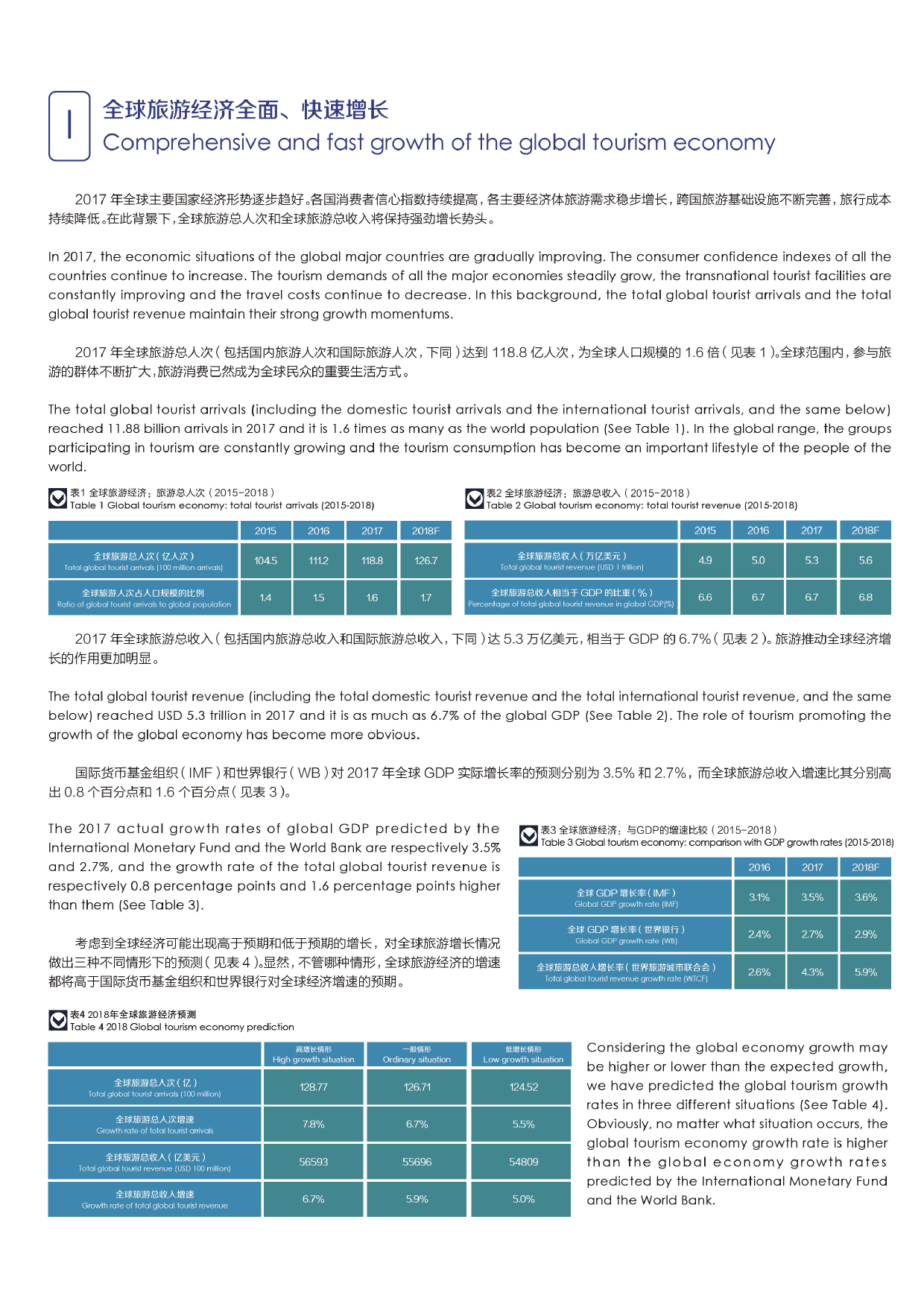 《世界旅游经济趋势报告(2018)》基于对全球旅游经济总规模等核心数据的研究分析,围绕“旅游在世界经济格局中的作用”这条主线,从全球旅游经济、旅游上市公司、科技改变旅游、旅游人才建设等4个角度进行深入研究,预测了2018年世界旅游经济的8个发展趋势: