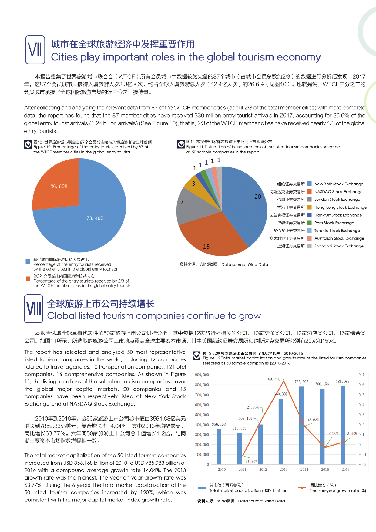 本报告搜集了世界旅游城市联合会会员城市中数据较为完备的87个城市(占城市会员总数约2/3)的数据进行分析后发现,2017年,这87个会员城市共接待入境旅游人次3.3亿人次,约占全球入境旅游总人次(12.4亿人次)的26.6%,也就是说,世界旅游城市联合会2/3的会员城市承接了全球国际旅游市场的近1/3接待量;