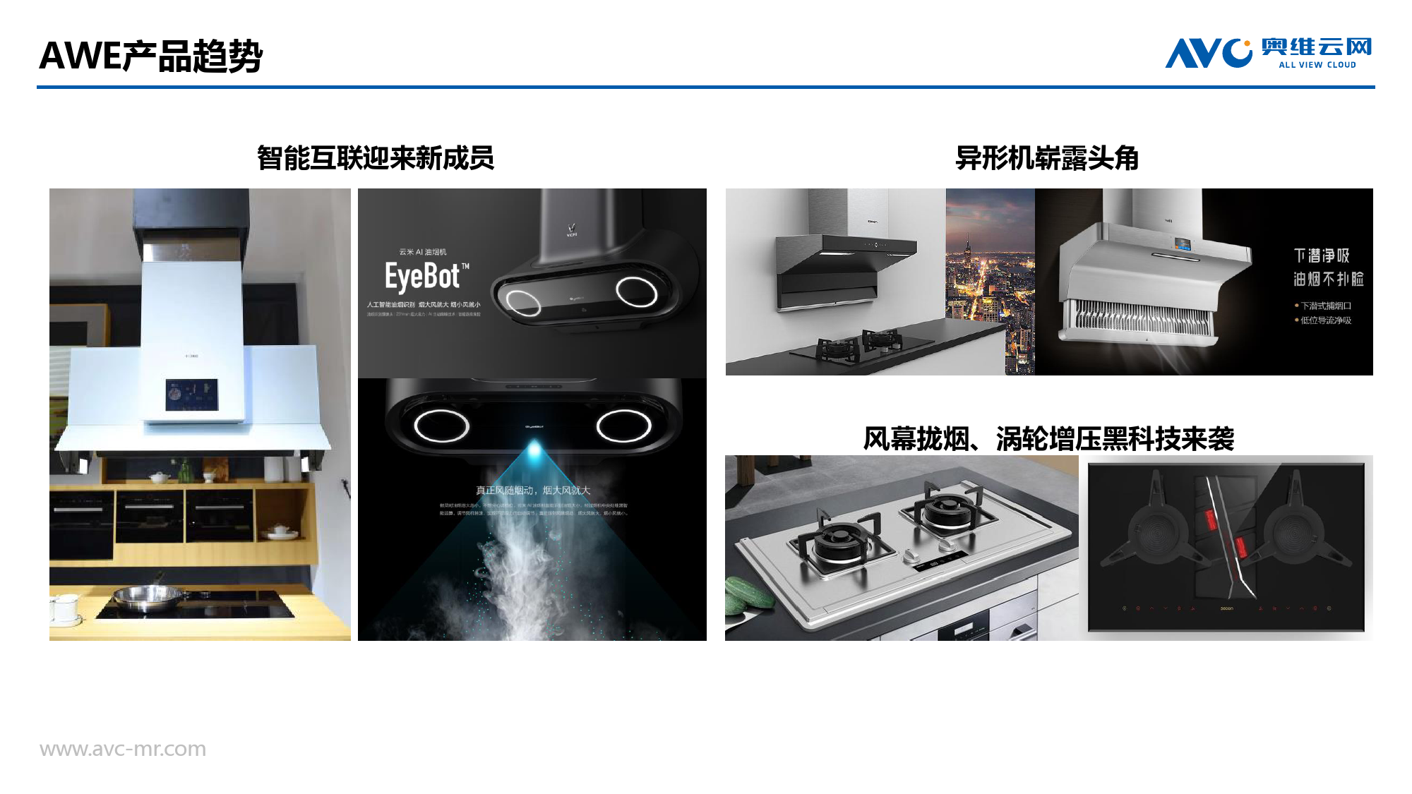 产品趋势:近吸式产品由于外形设计多样化,进一步受到消费者青睐,市场份额显著增长。排风量依然是各品牌军备竞赛的主要指标。AWE上异形机悉数亮相,或掀起一轮新设计浪潮。