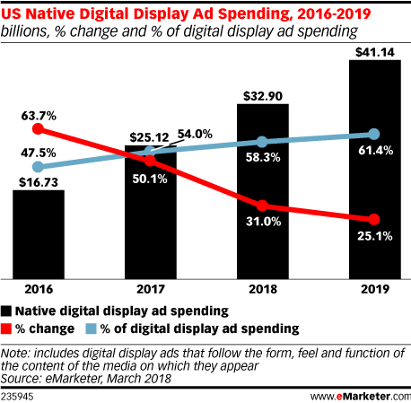 由于社交网络和移动设备广告的大规模增长,而原生广告在这两个领域都占有主导地位,这推动原生广告占美国2018年网络展示广告支出的一半以上。根据eMarketer的新报告“美国原生网络展示广告预测:移动增长引领潮流”,今年,美国营销人员将在原生网络展示广告方面支出329亿美元,比2017年增长31.0%。