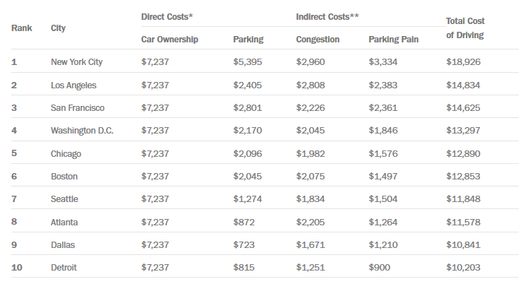 按照城市细分,纽约市是30个城市中驾驶成本最昂贵的。2017年,纽约市的驾驶总成本几乎是美国平均水平的两倍,每名驾驶员支出18,926美元,主要是由于停车费用。调查发现,纽约人停车更频繁(每周10次),支付频率更高(60%),支出最多(平均2小时28美元)。底特律汽车驾驶成本为平均每人10203美元,是成本最低的城市,主要是由于停车费更便宜。