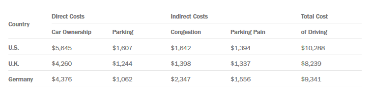 2017年,美国司机平均的驾车成本是10288美元,包括直接成本(维护、燃油、保险、停车和通行费)和间接成本(浪费的时间和碳排放,停车罚款等)。有趣的是,交通和停车相关的成本占美国司机总成本的近一半(45%)。