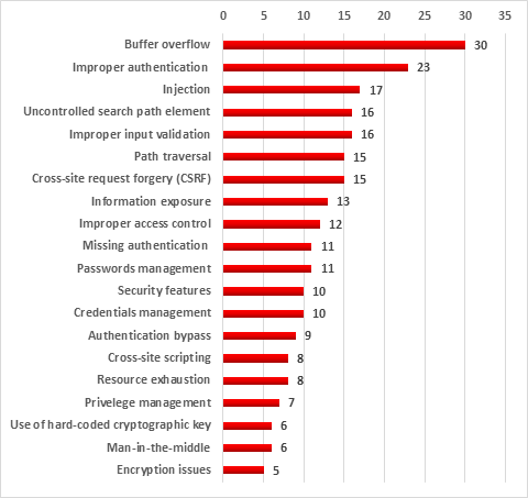 按漏洞类型划分,最常见的是缓冲溢出和不当认证。同时,23%的漏洞和网络相关,21%的漏洞和认证问题及访问控制问题有关。