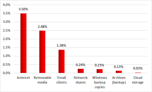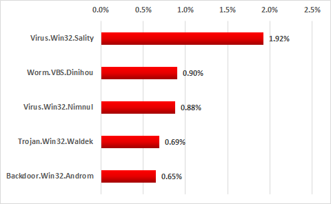 近2%的系统受到Virus.Win32.Sality恶意软件的攻击。除了感染其他可执行文件外,该恶意软件还包括抵御反病毒解决方案和从命令与控制服务器下载其他恶意模块的功能。最普遍的Sality模块是用于发送垃圾邮件、窃取存储在系统中的认证数据以及下载和安装其他恶意软件的组件。