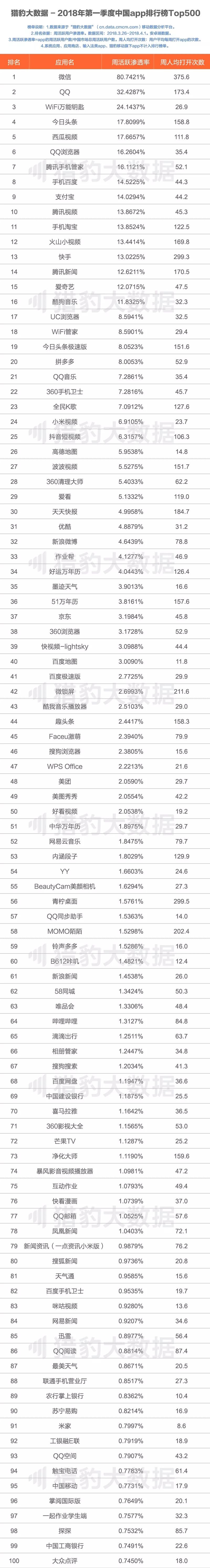 - 短视频依然是移动互联网最具影响力的领域,越来越多的短视频app进入排行榜头部。Top50中共有七款短视频社交产品,卷土重来的腾讯微视在一季度也已杀入TOP500。这体现出了短视频的产品形式在移动互联网用户中的接受程度和火热程度还在稳步攀升。