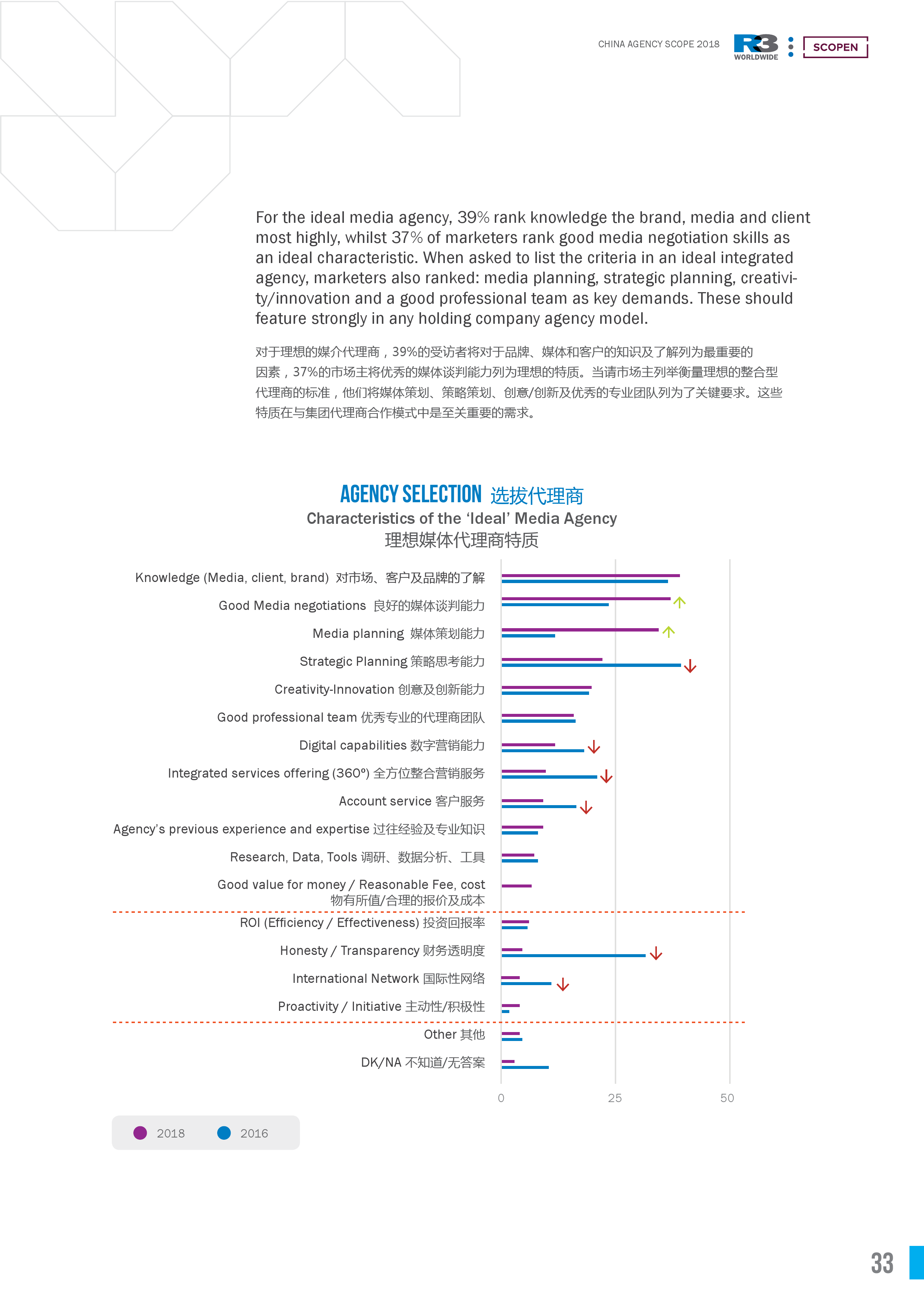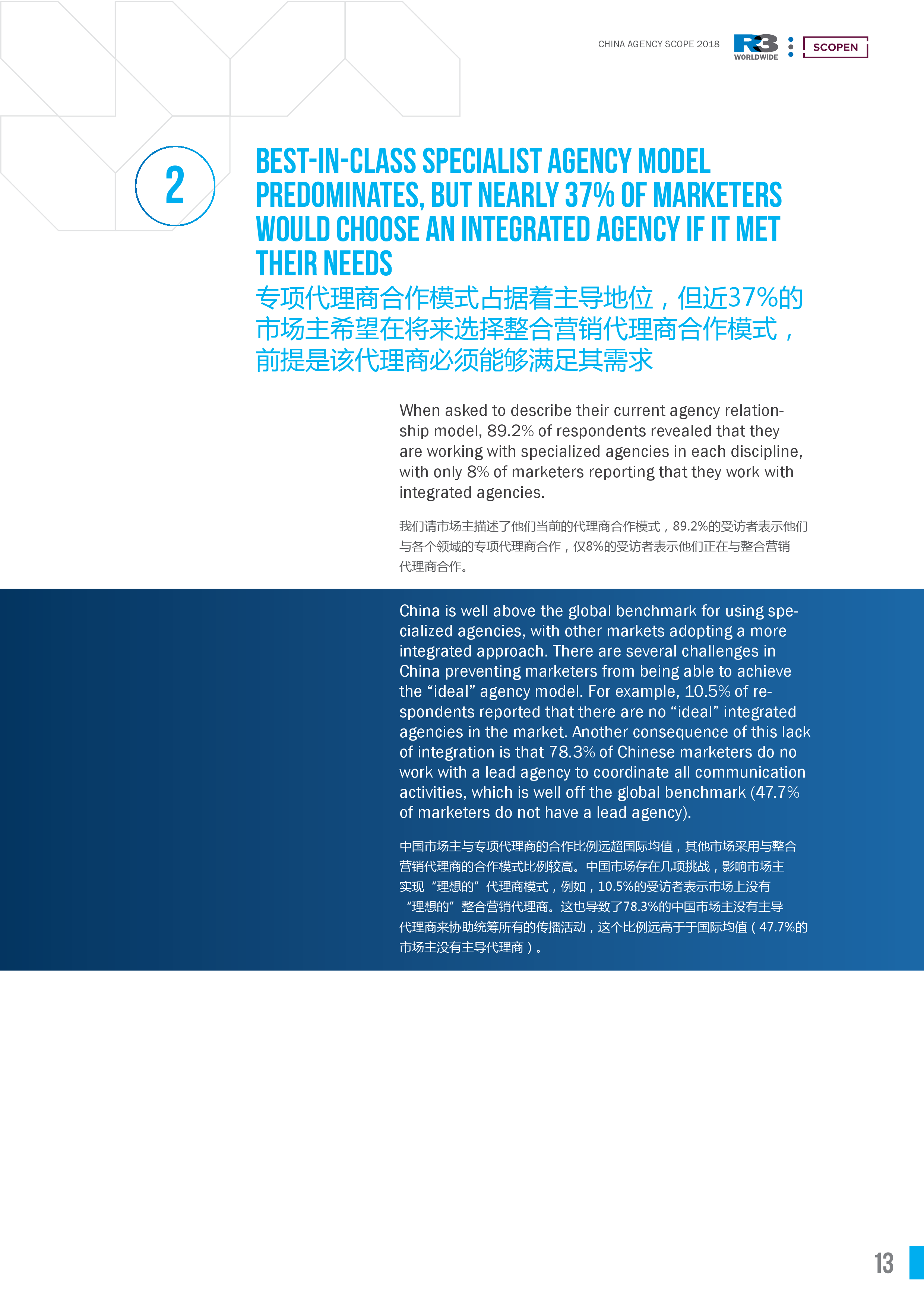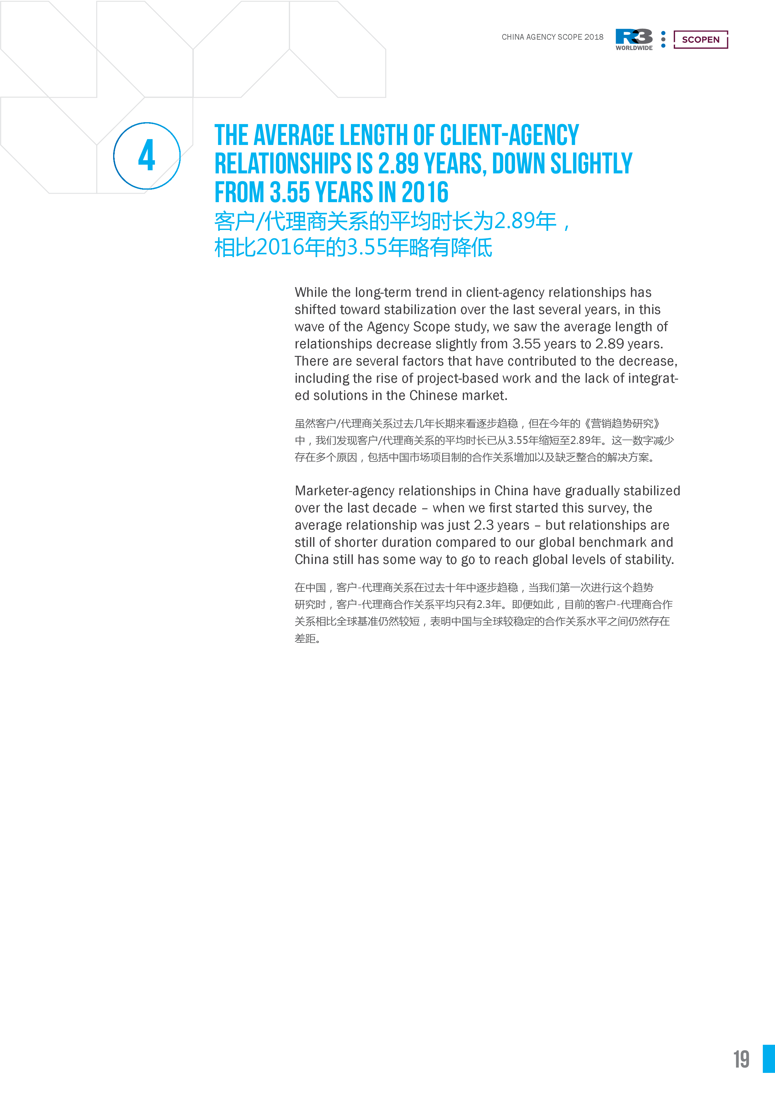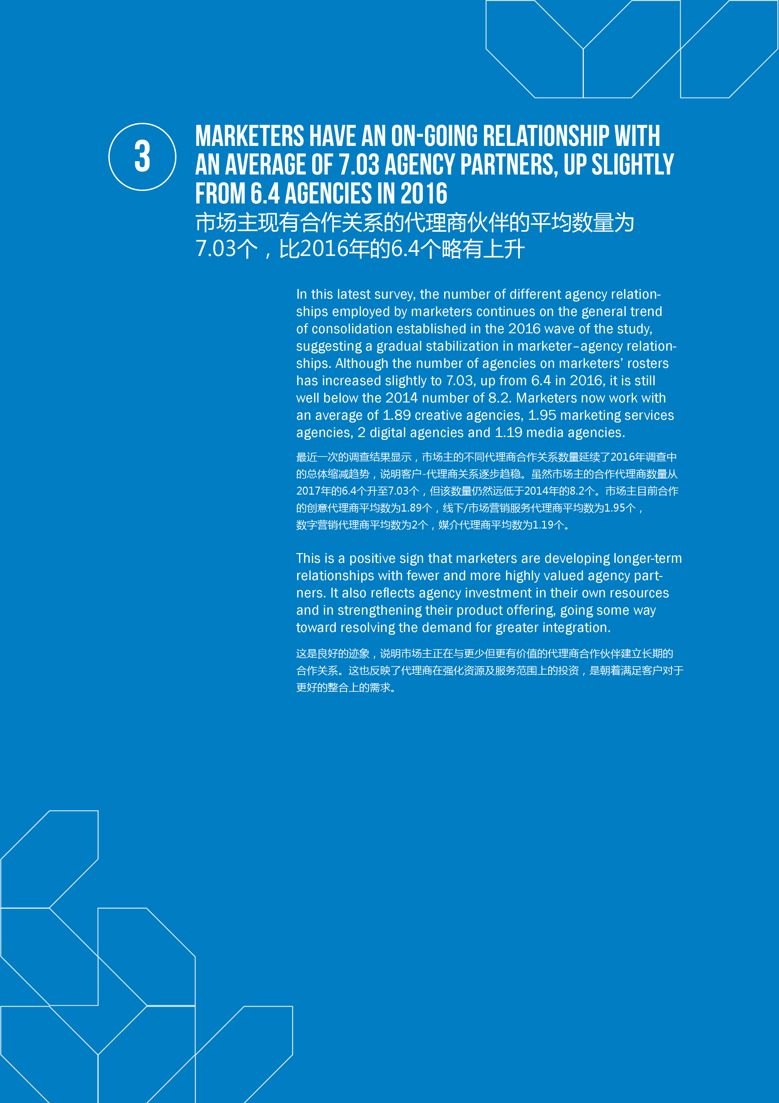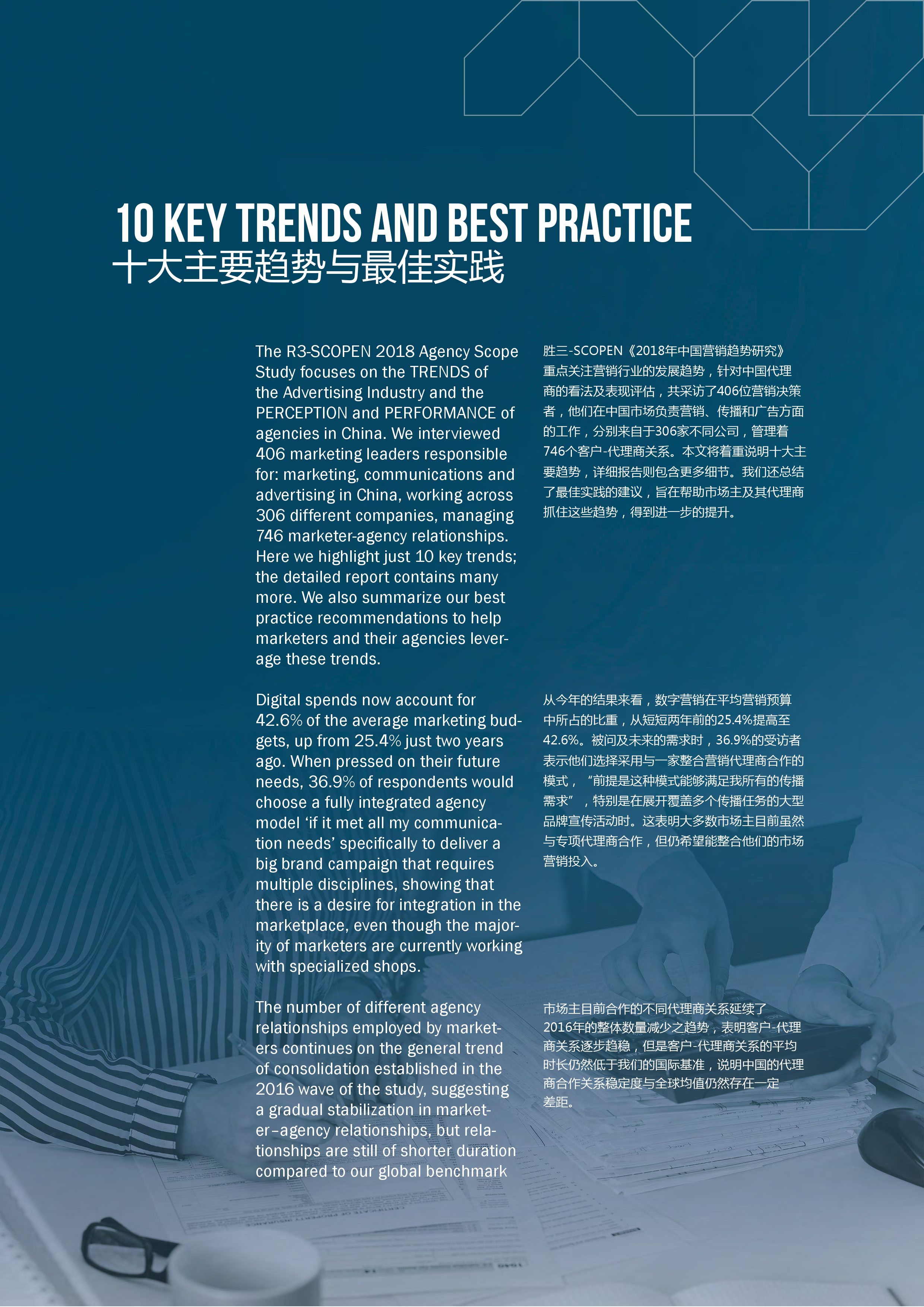 胜三-SCOPEN《2018年中国营销趋势研究》重点关注营销行业的发展趋势,针对中国代理商的看法及表现评估,共采访了406位营销决策者,他们在中国市场负责营销、传播和广告方面的工作,分别来自于306家不同公司,管理着746个客户-代理商关系。本文将着重说明十大主要趋势,详细报告则包含更多细节。我们还总结了最佳实践的建议,旨在帮助市场主及其代理商抓住这些趋势,得到进一步的提升。