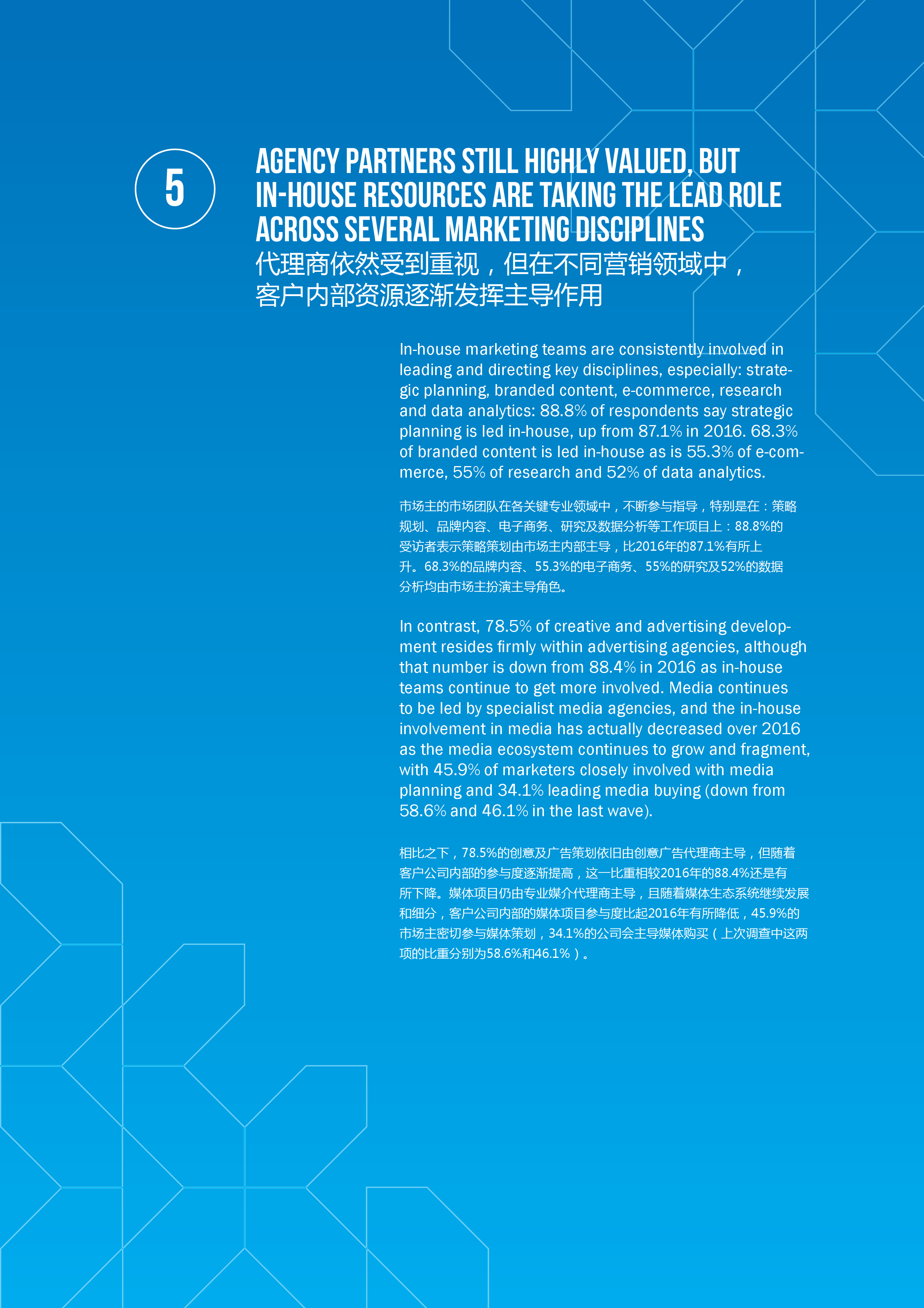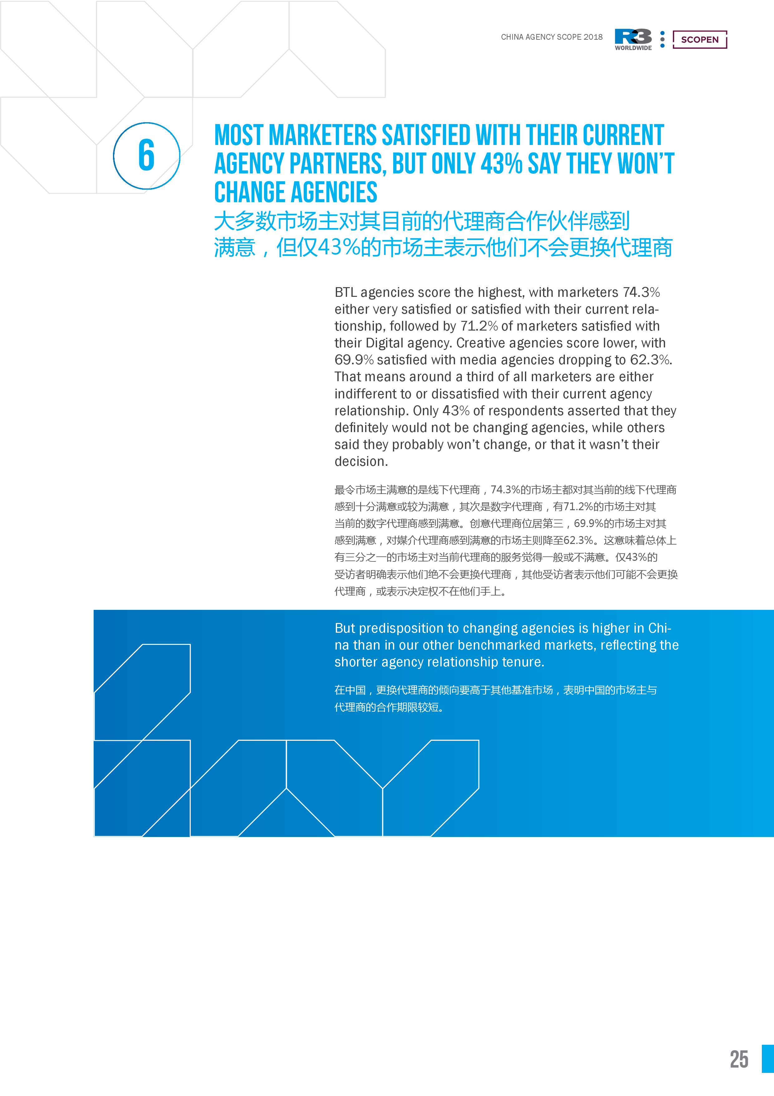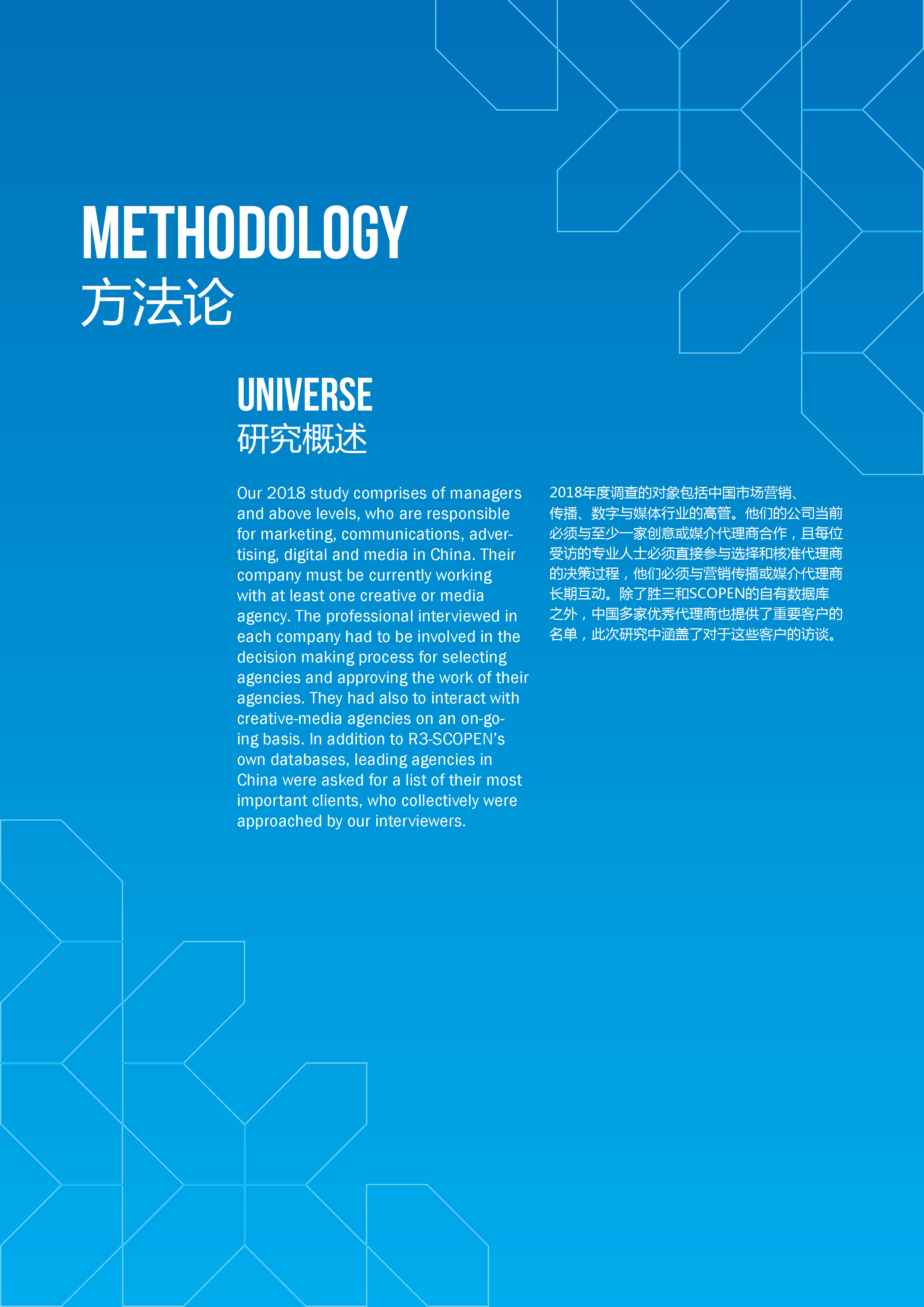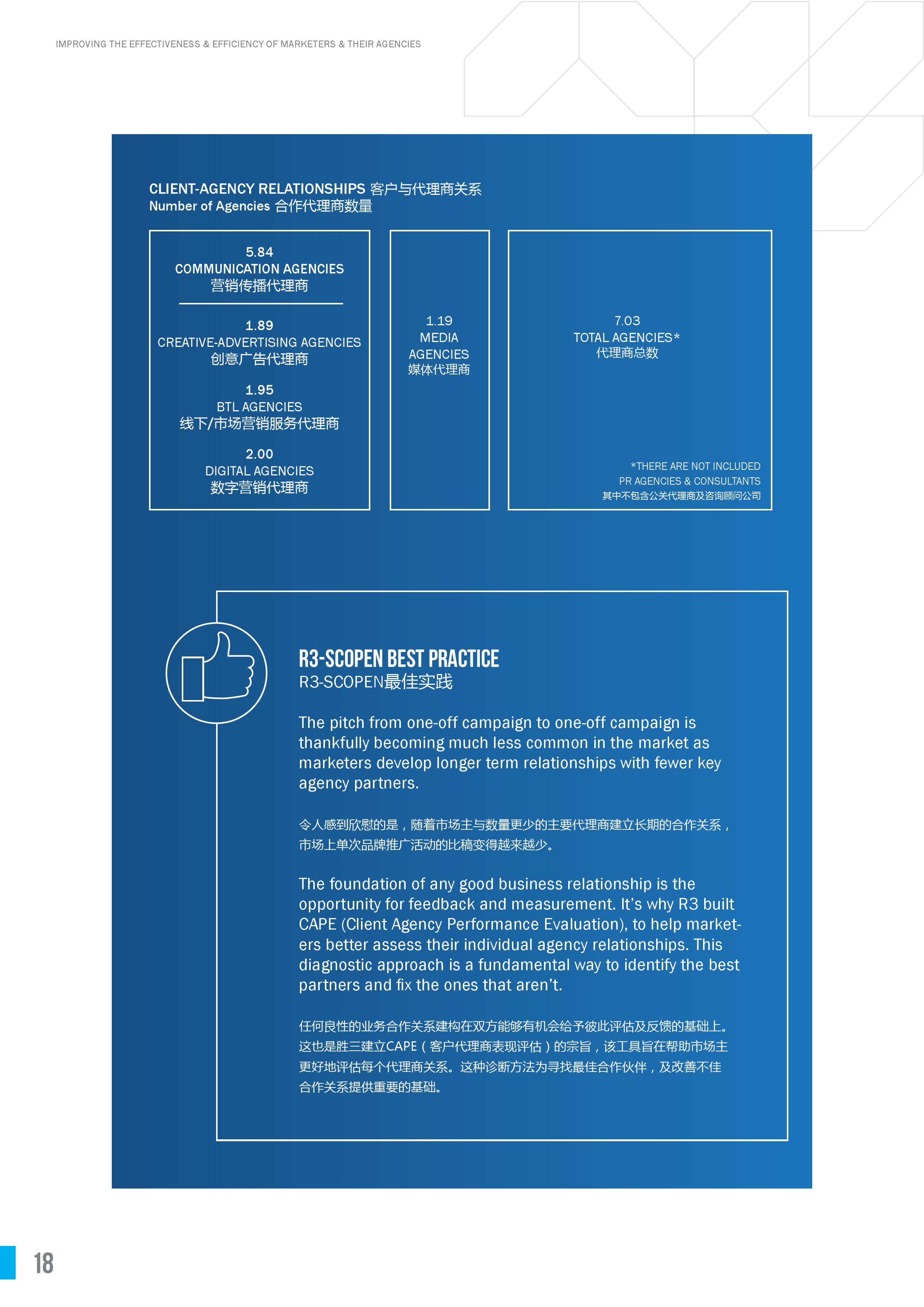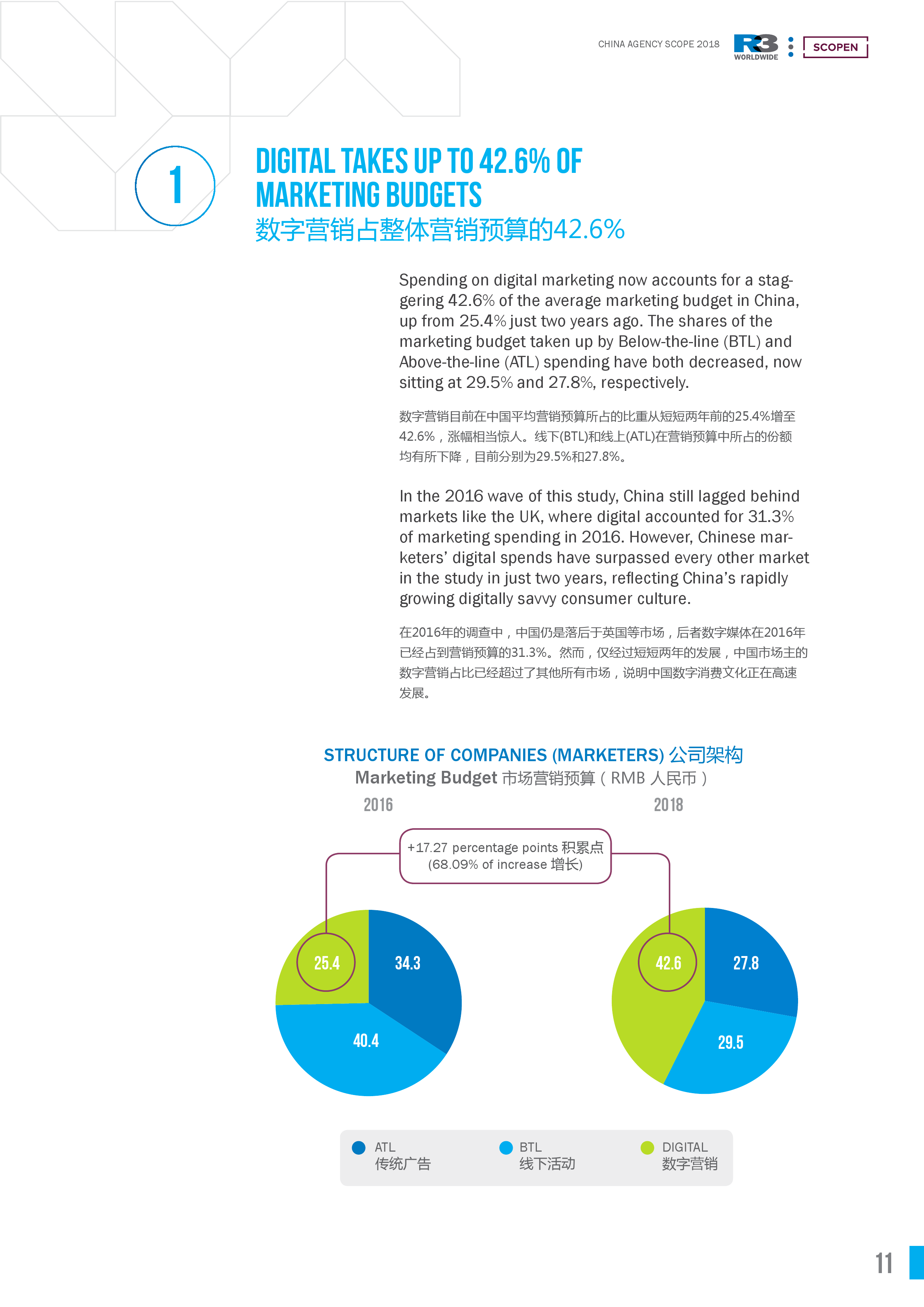 胜三-SCOPEN《2018年中国营销趋势研究》重点关注营销行业的发展趋势,针对中国代理商的看法及表现评估,共采访了406位营销决策者,他们在中国市场负责营销、传播和广告方面的工作,分别来自于306家不同公司,管理着746个客户-代理商关系。本文将着重说明十大主要趋势,详细报告则包含更多细节。我们还总结了最佳实践的建议,旨在帮助市场主及其代理商抓住这些趋势,得到进一步的提升。