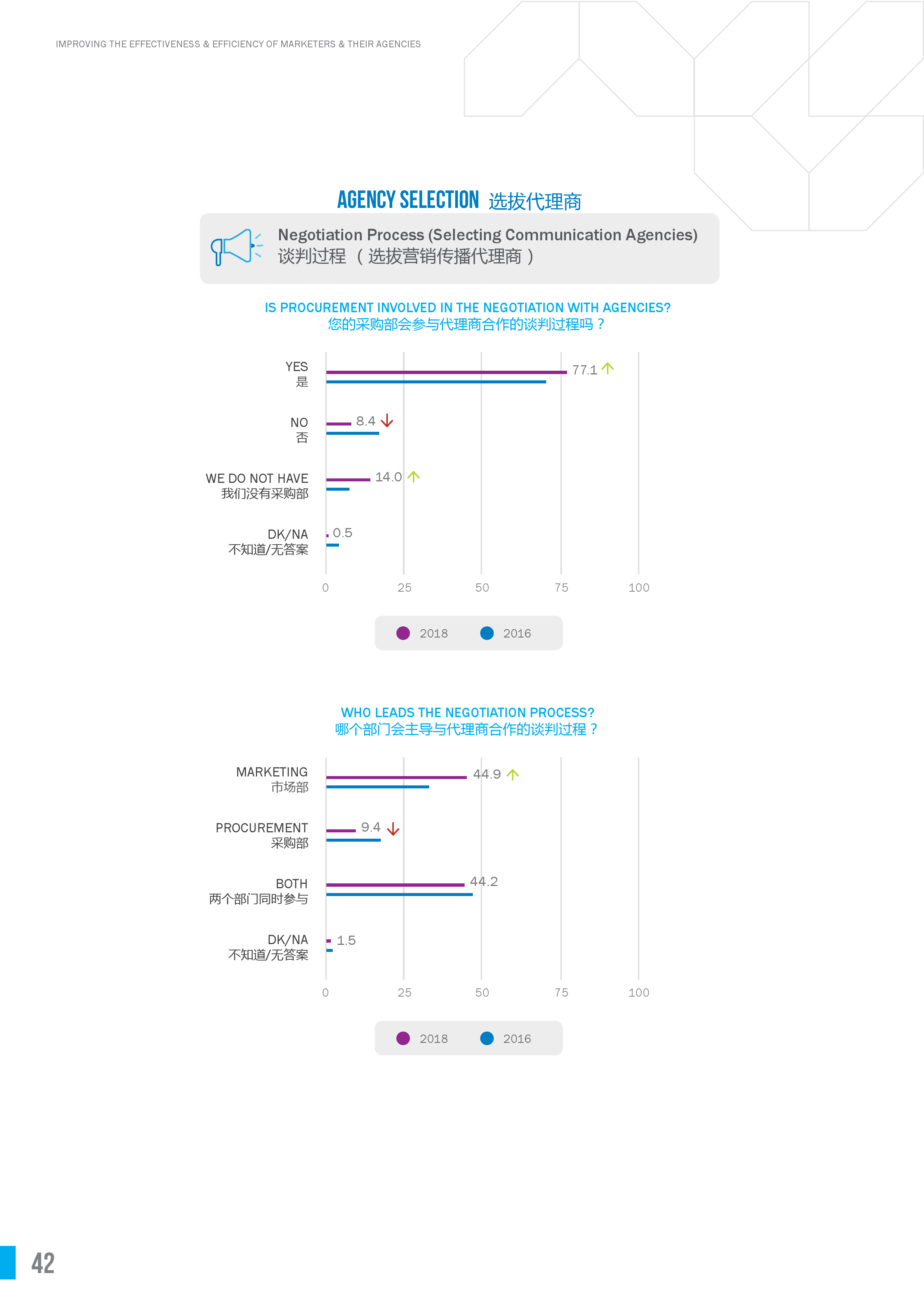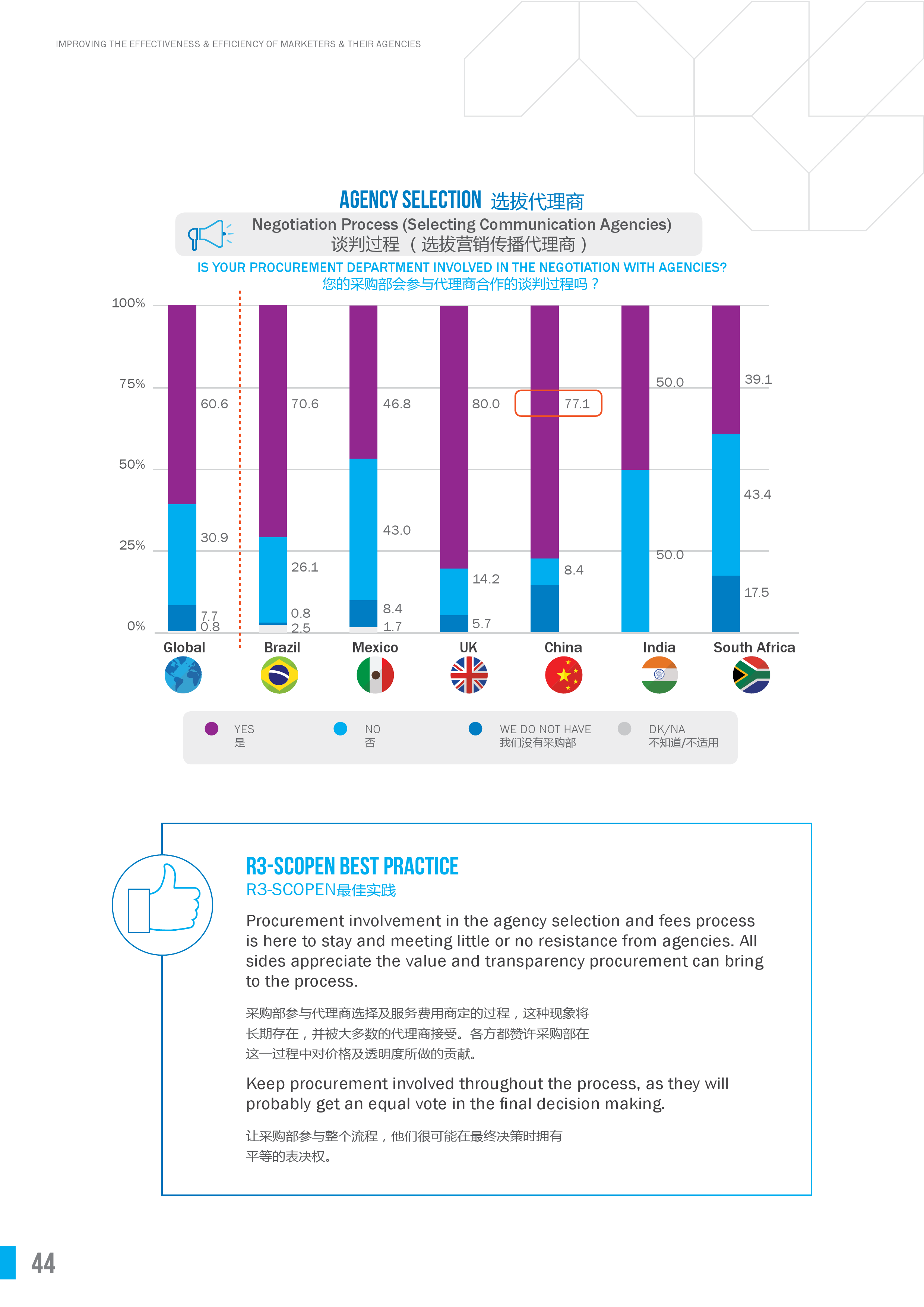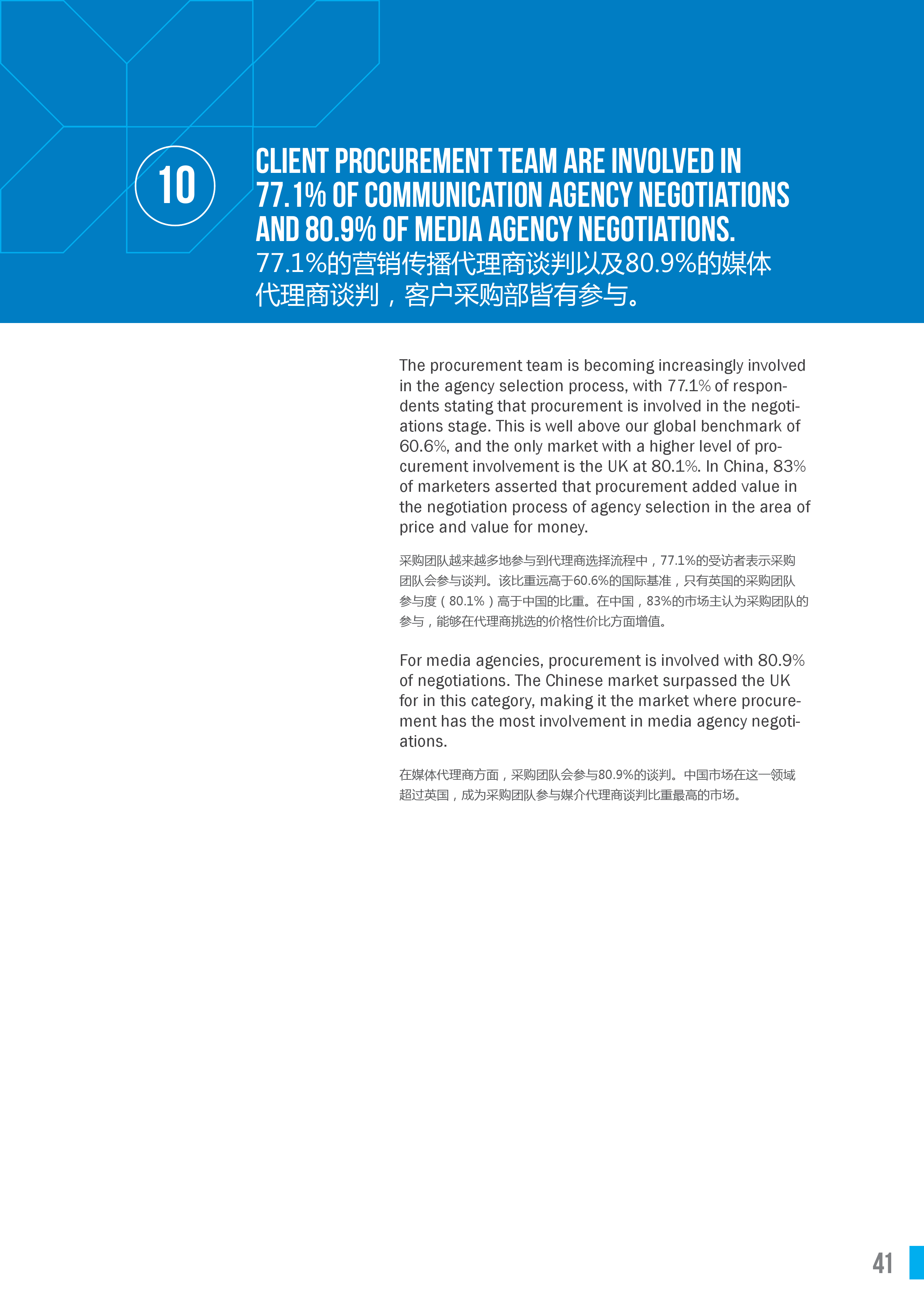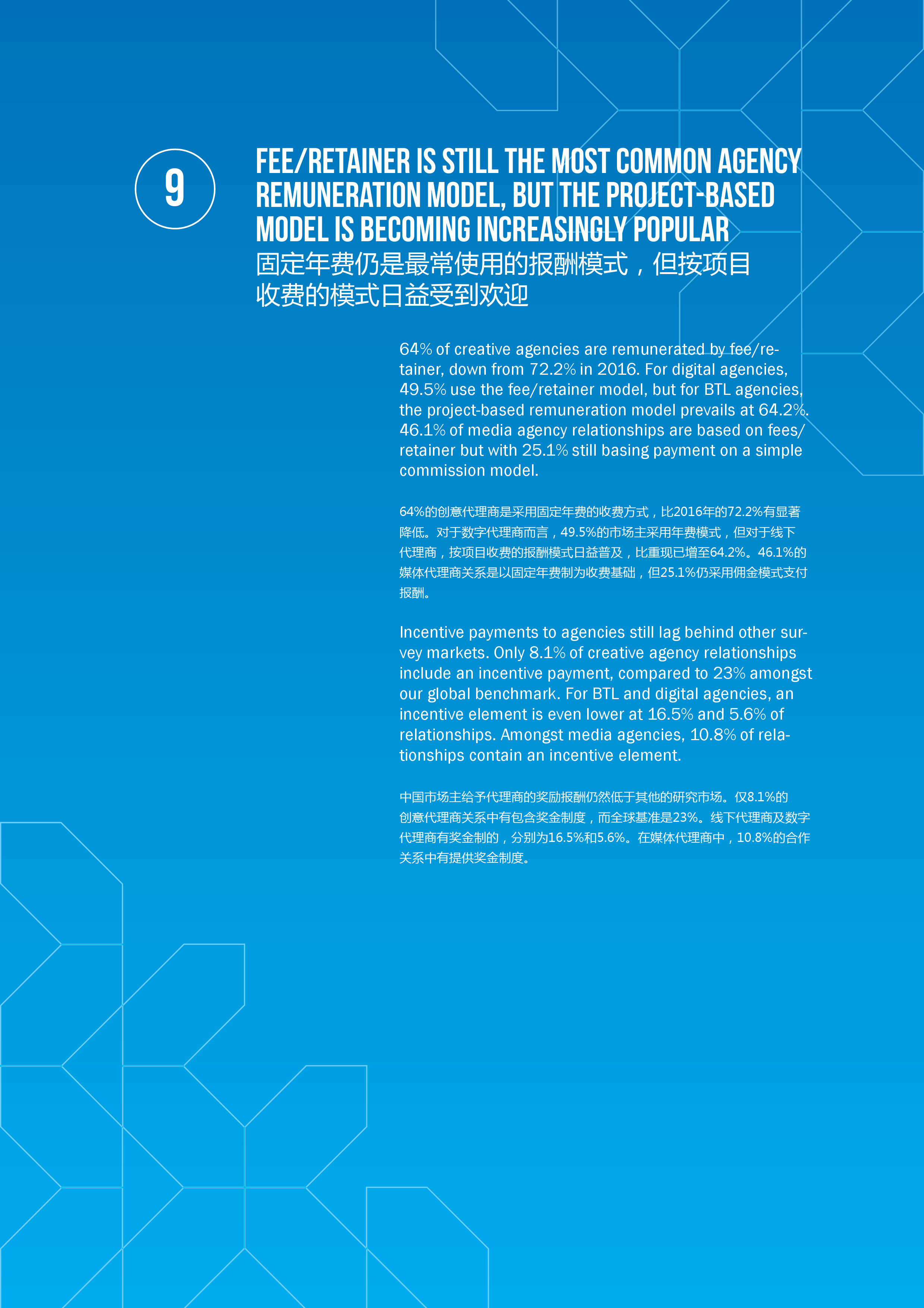 市场主的营销团队在各关键专业领域中,持续增加其参与度,特别是在:策略规划、品牌内容、电子商务、研究及数据分析等事务上。报告发现,虽然固定服务费/年费模式仍然是最常见的报酬模式,项目制的收费模式正在日益普及。此外,在与营销传播和媒介代理商的挑选与谈判过程中,采购团队的参与及责任越来越大。