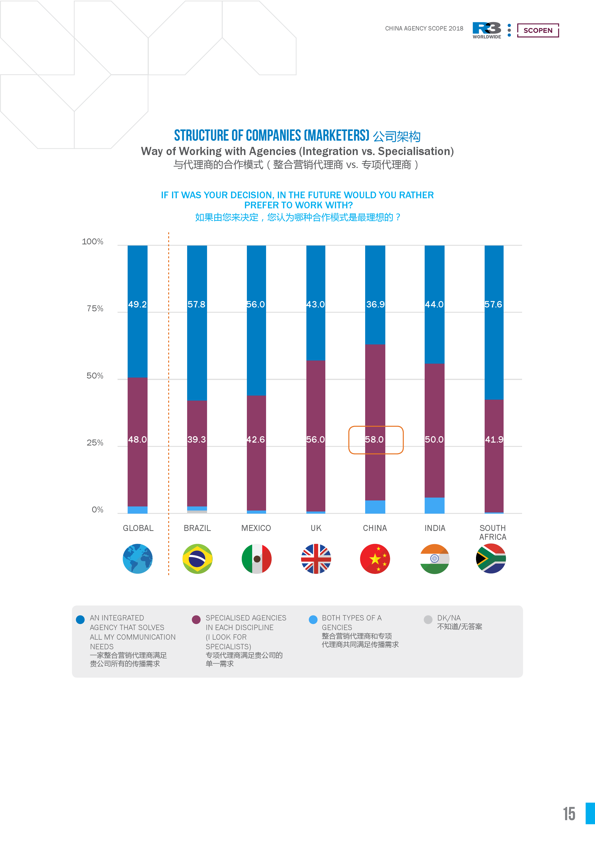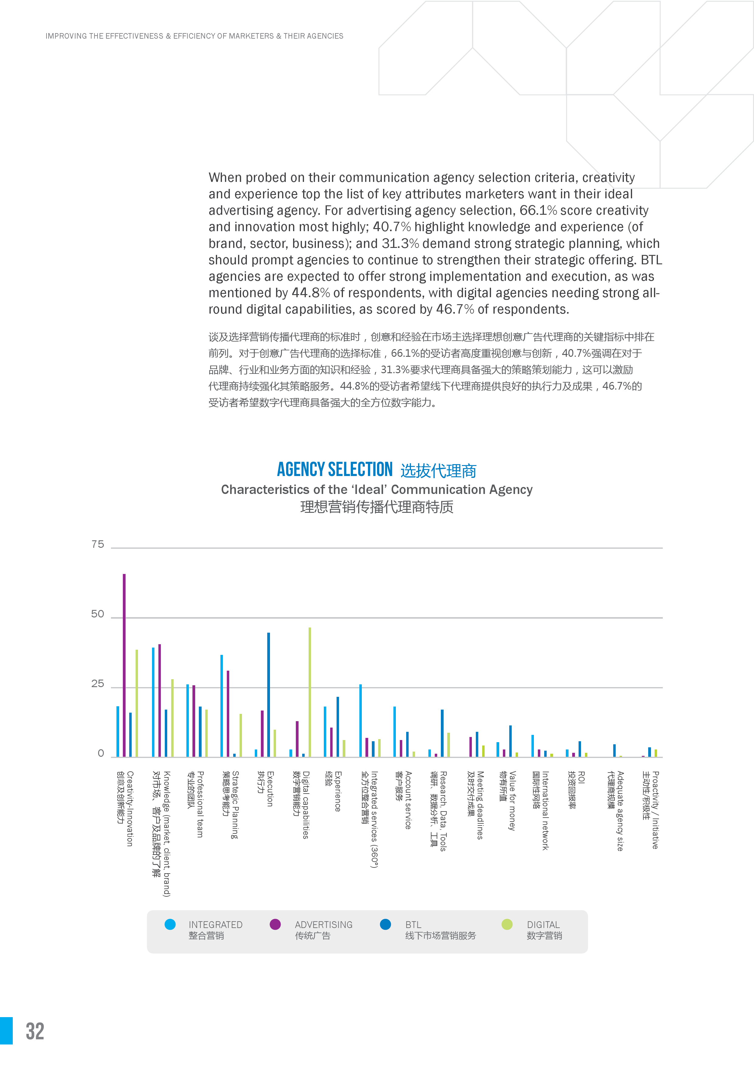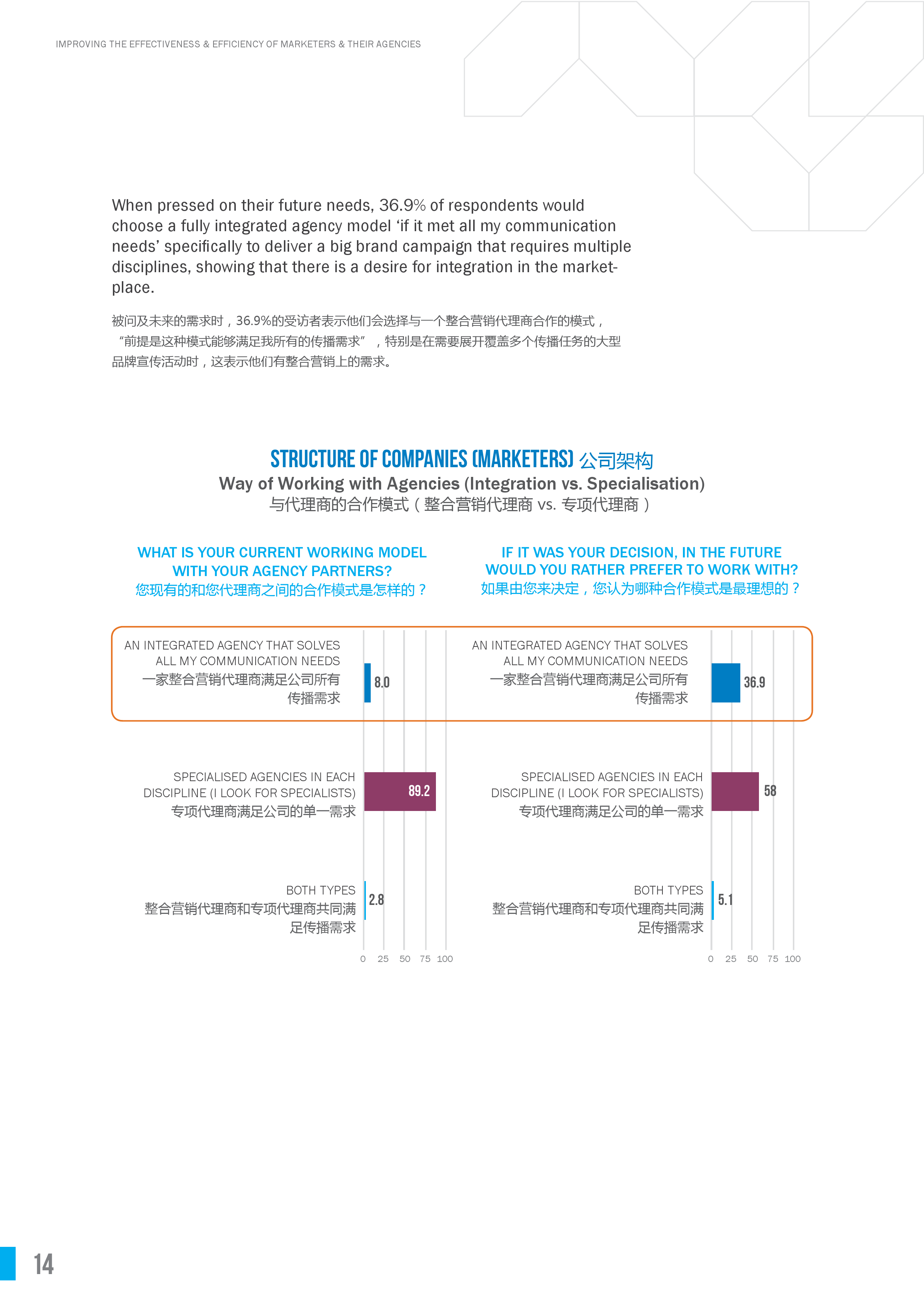 从今年的结果来看,数字营销在平均营销预算中所占的比重,从短短两年前的25.4%提高至42.6%。被问及未来的需求时,36.9%的受访者表示他们选择采用与一家整合营销代理商合作的模式,“前提是这种模式能够满足我所有的传播需求”,特别是在展开覆盖多个传播任务的大型品牌宣传活动时。从报告发现,这表明大多数市场主目前虽然与专项代理商合作,但仍希望能整合他们的市场营销投入。