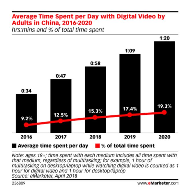 eMarketer表示,数字视频服务的发展是这个变化的“关键驱动因素”。该公司预计,平均来看,中国成年人每天看在线视频的时间将同比增长26%,达到58分钟。而到2020年,中国成年人将有1/3的上网时间用来看视频。