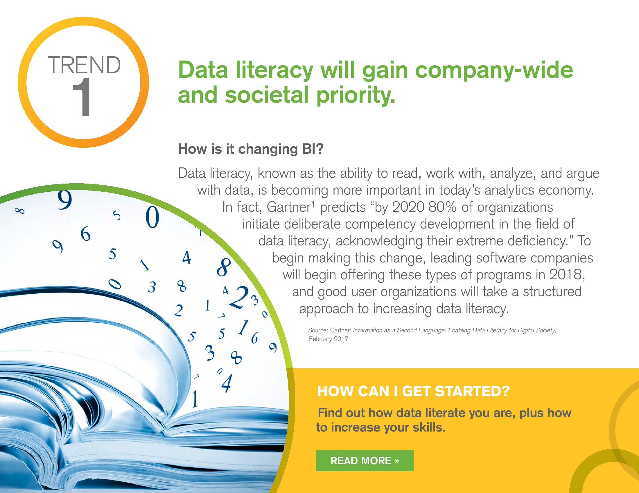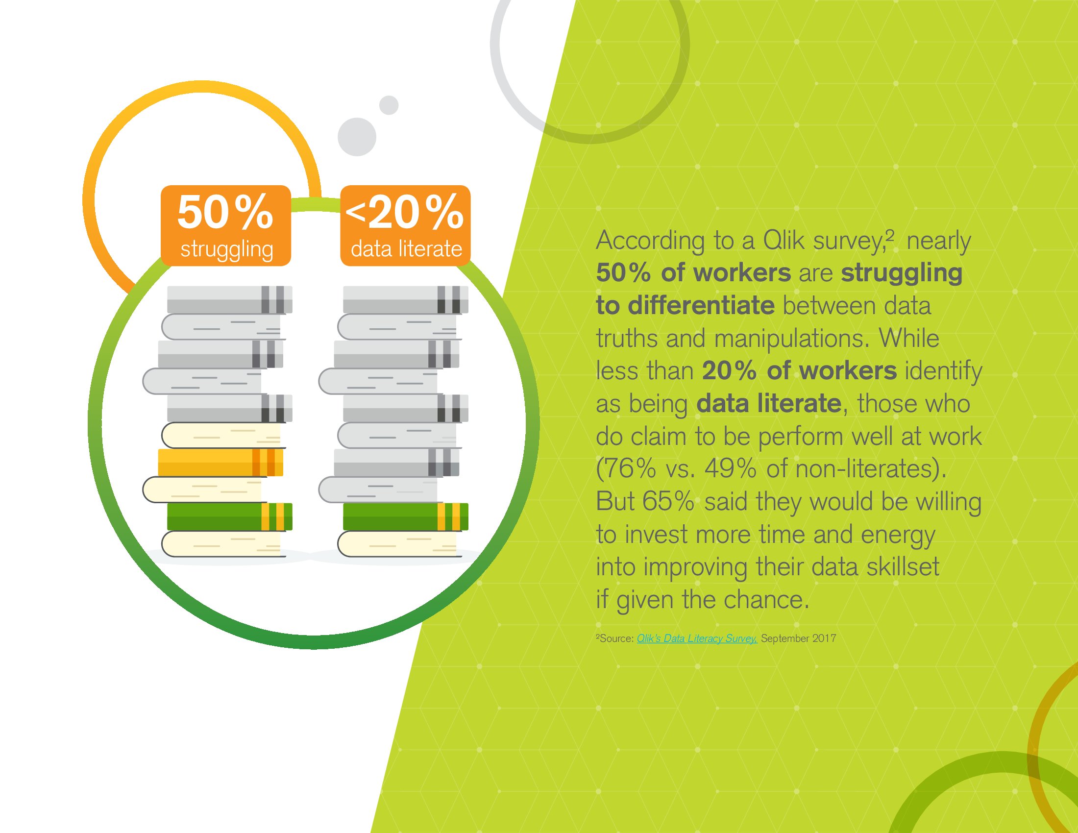 - 数据素养将在全公司和全社会范围获得优先权。根据Qlik的调查,将近50%的员工正在努力区分数据真相和操作。 只有不到20%的员工具备数据素养,相比之下49%不具备数据素养。但是,65%的受访者愿意投入更多时间和精力来改善数据技能,如果有更多机会。