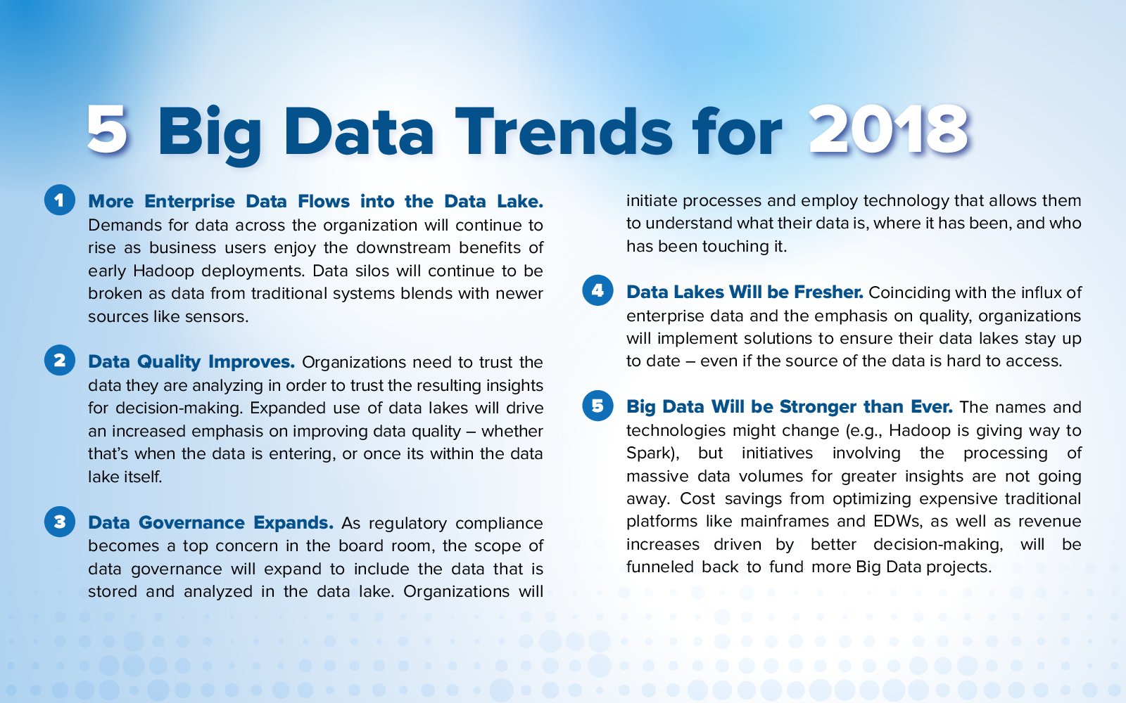 1 更多企业数据将进入数据湖。随着企业用户已经享受到早期Hadoop部署的下游收益,整个企业对数据的需求将继续增加。由于来自传统系统的数据和传感器等新型数据资源不断融合,数据孤岛将继续被打破。