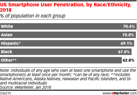 尽管黑人消费者和总人口的智能手机普及率的差异可以忽略不计,但检查人们如何上网时,就会出现差距。例如,2017年7月CivicScience的调查显示,黑人比一般受访者更可能将智能手机作为访问互联网的主要手段,45% vs. 36%。
