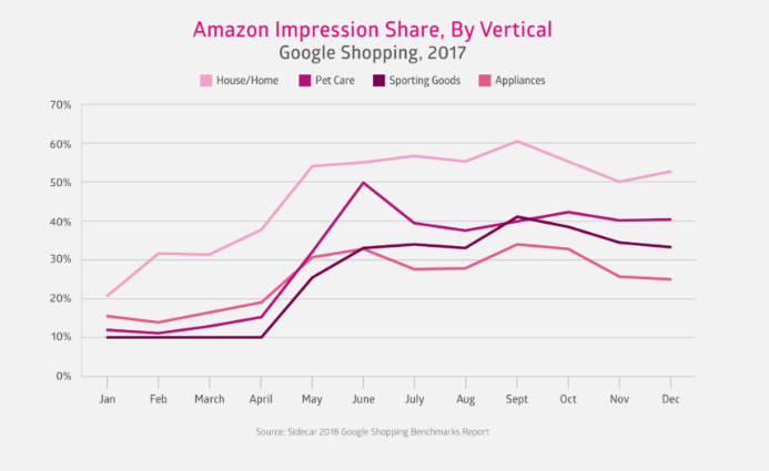 尽管今年开始的关键垂直行业的份额相当有限,但亚马逊在Google Shopping上的投入更多。6月份亚马逊在宠物护理垂直行业的展现份额达到约50%,9月份体育用品垂直行业的份额达到40%。