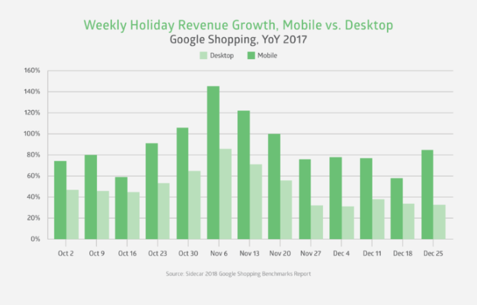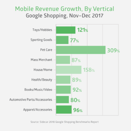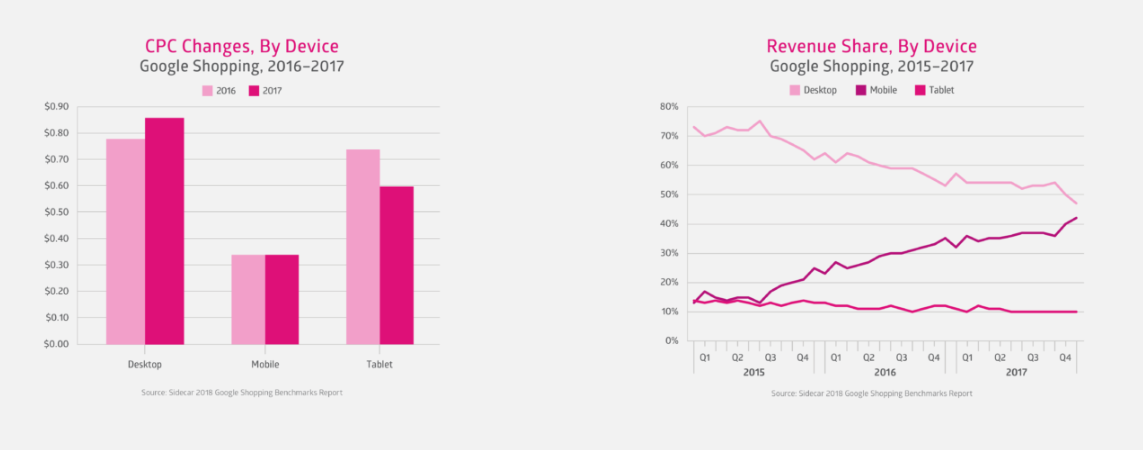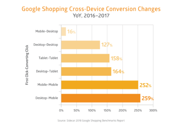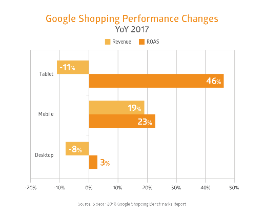 鉴于移动转换的舒适度不断提高,收入偏向更小的屏幕并不奇怪。事实上,以平板电脑(-11%)和PC(-8%)为代价, Google Shopping移动零售商收入份额增长了19%。