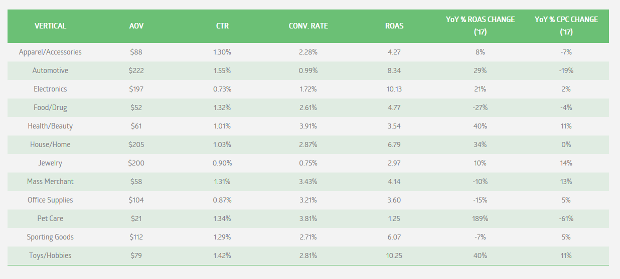 点击率(CTR):汽车(1.55%)、玩具/兴趣(1.42%)和宠物护理(1.32%);