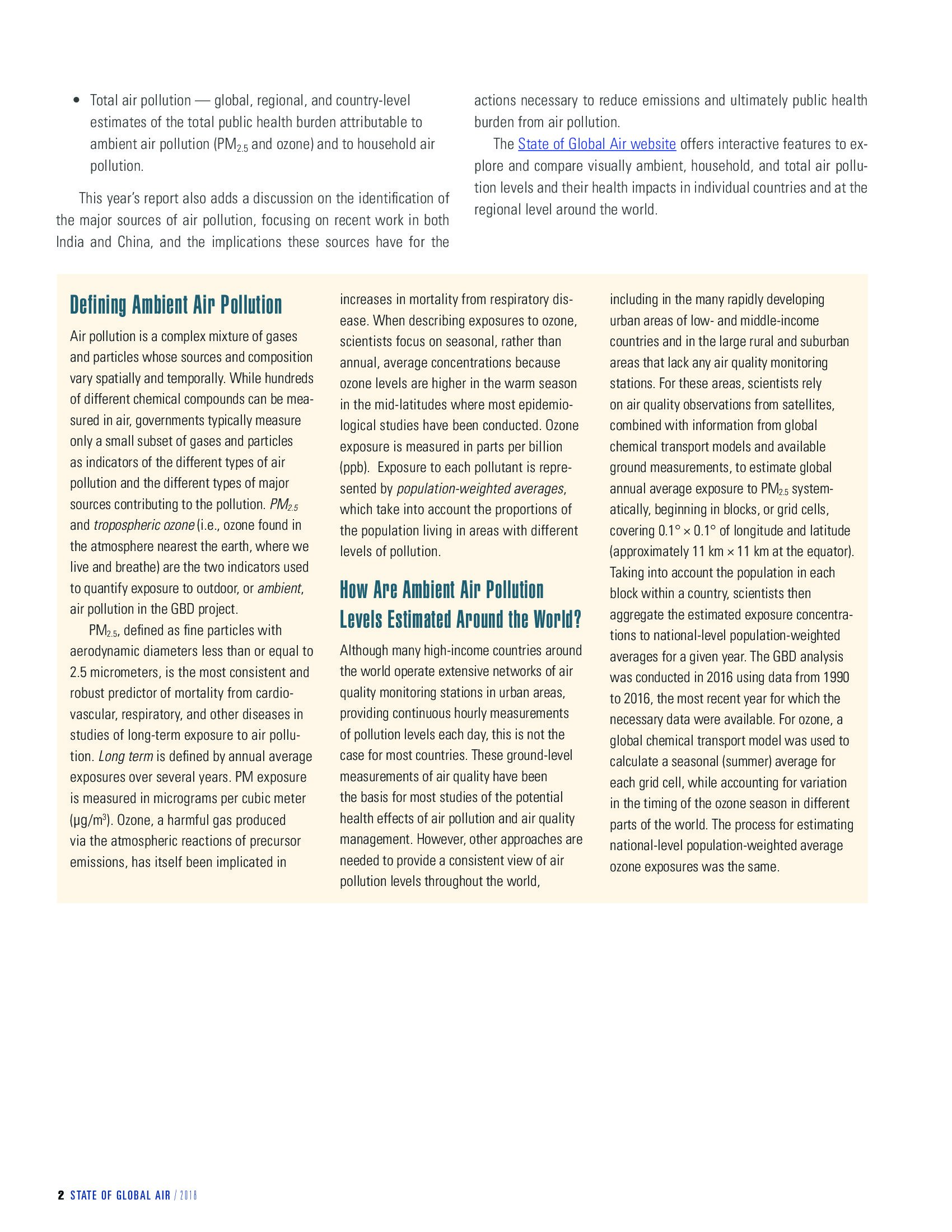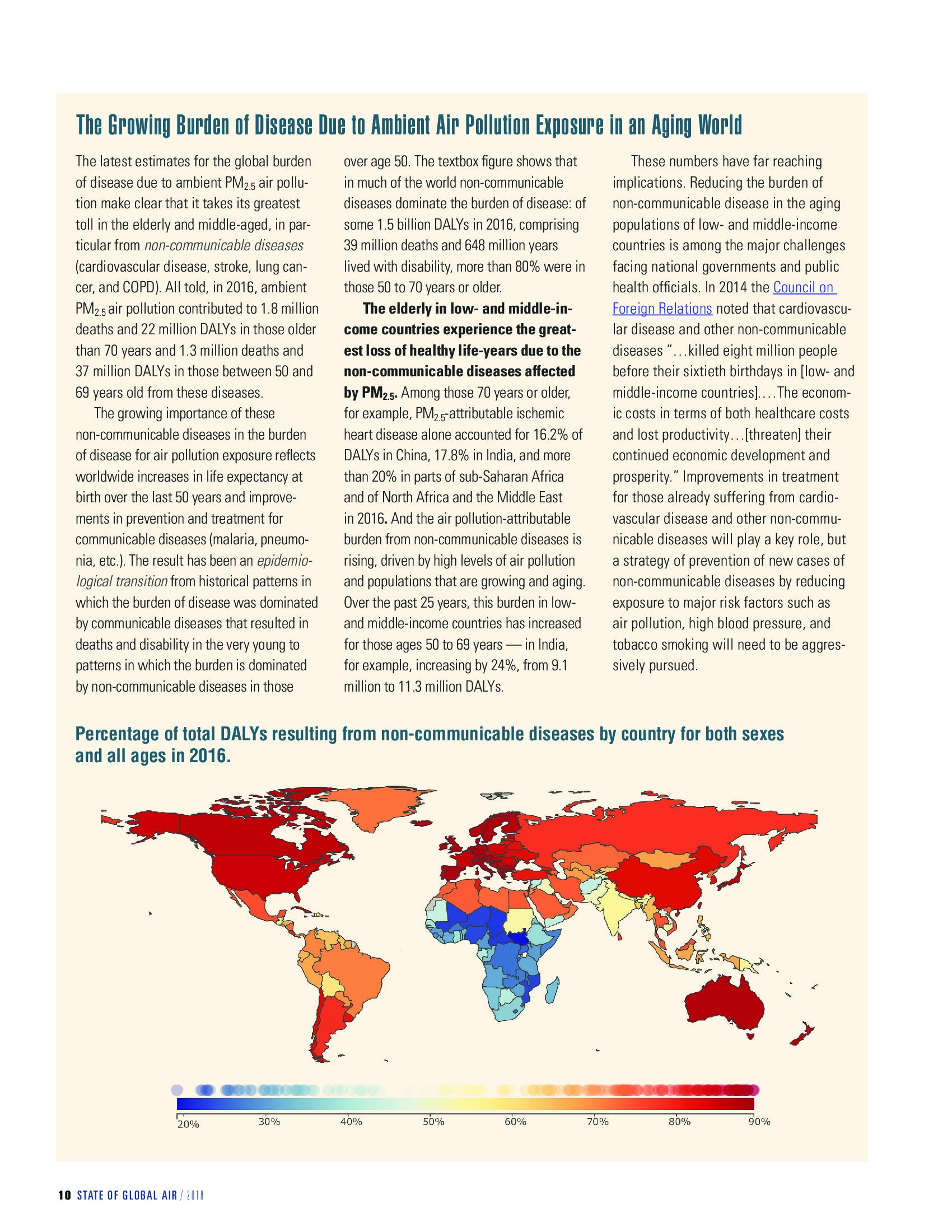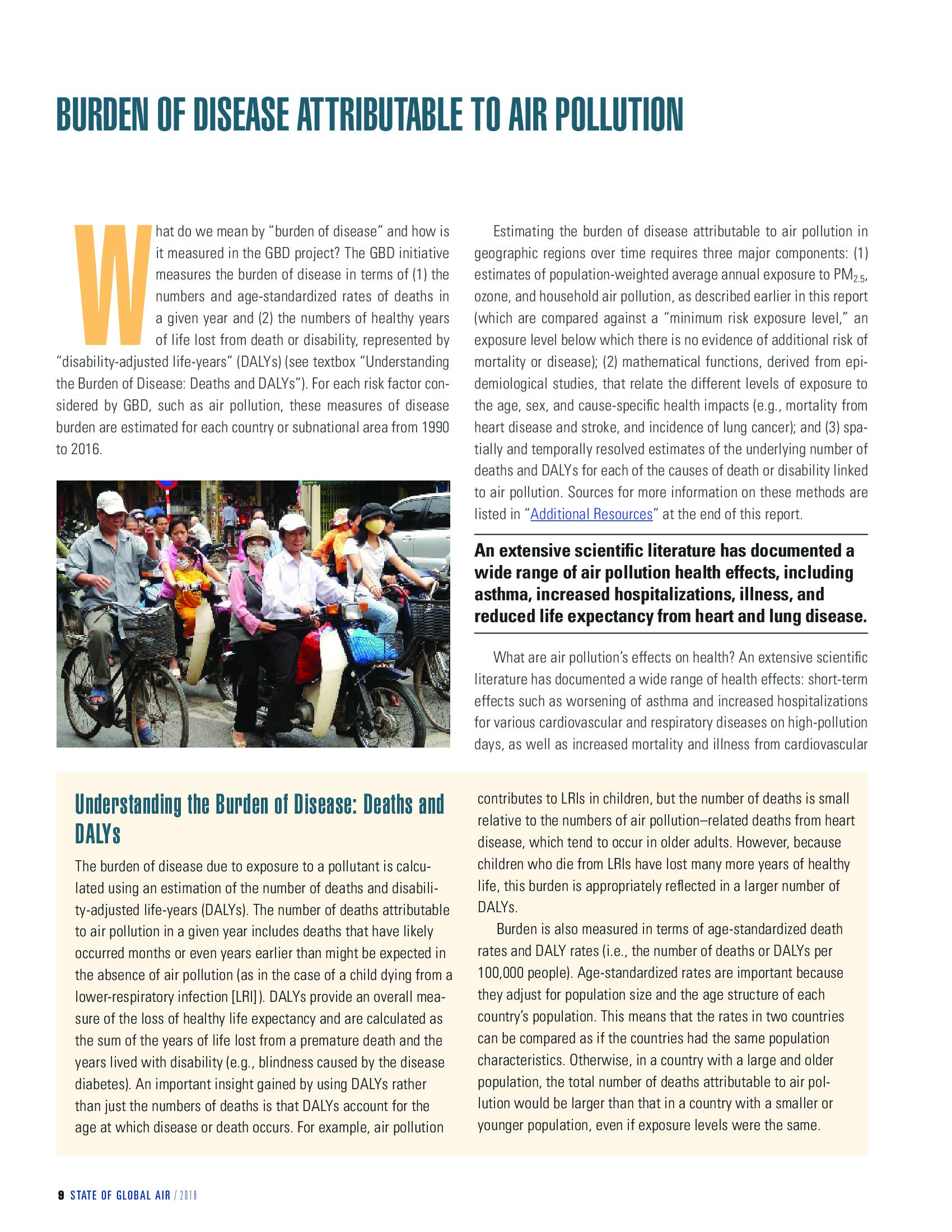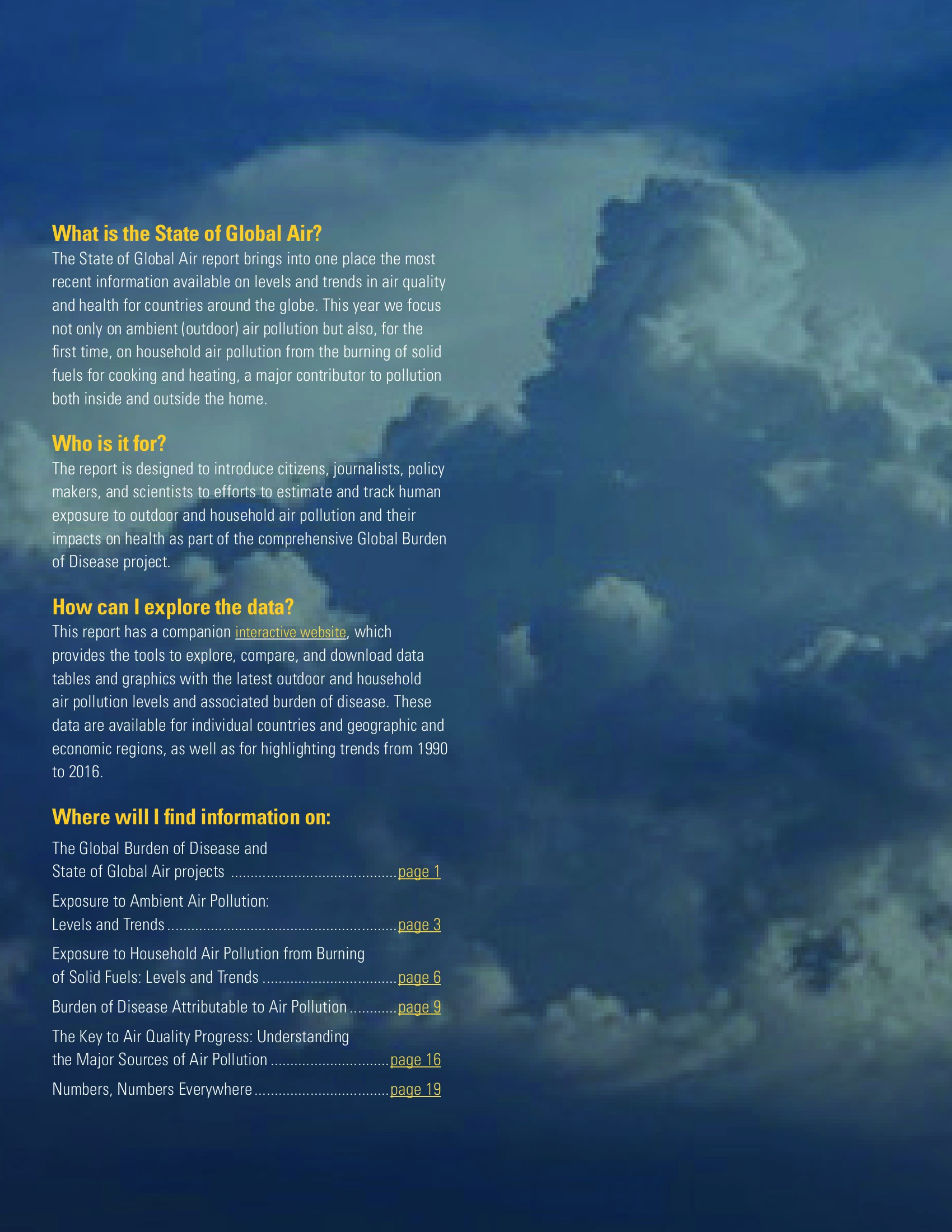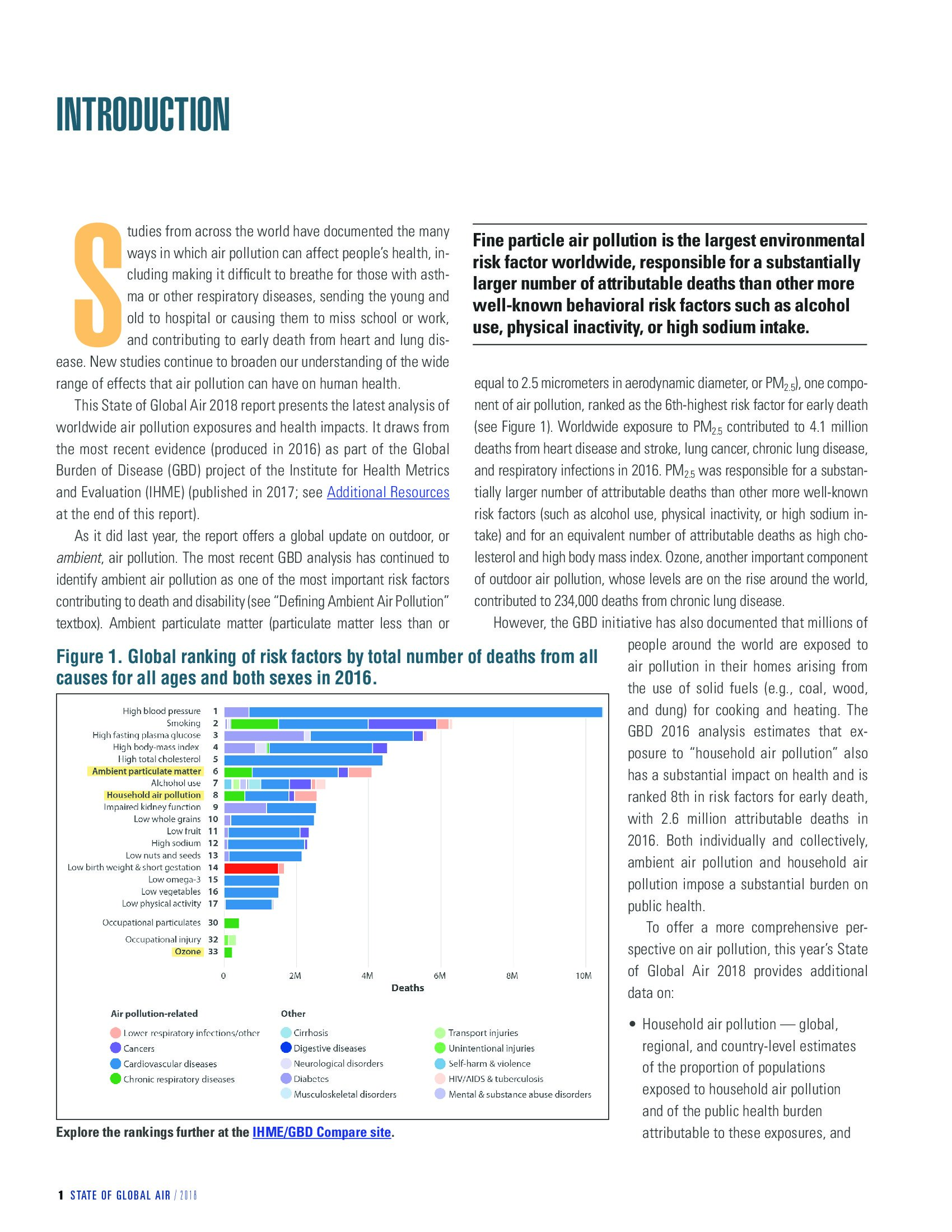 来自全球各地的调查已经证明,空气污染会影响人类的健康,例如导致哮喘或其他呼吸系统疾病,影响及时就医,心脏和肺部疾病导致的早亡等。IHME的报告“2018全球空气状况”介绍了全球空气污染最新情况,并分析了空气污染可能对人类健康产生的更广泛的影响。