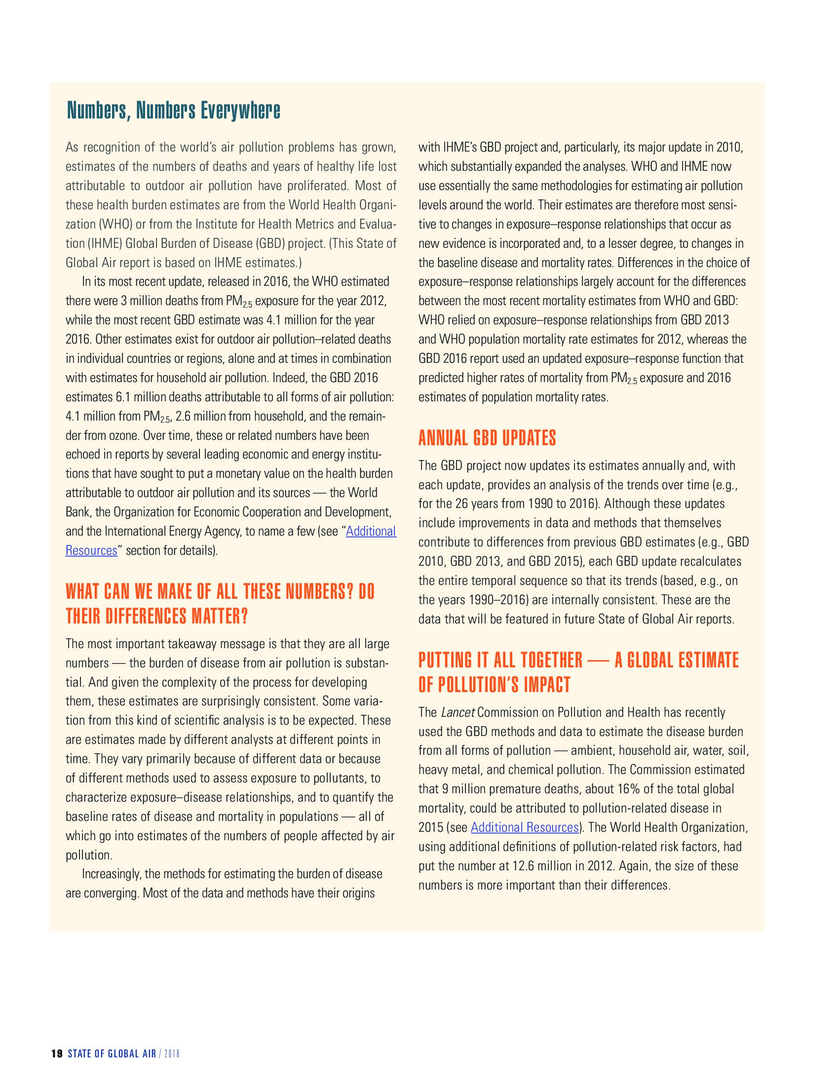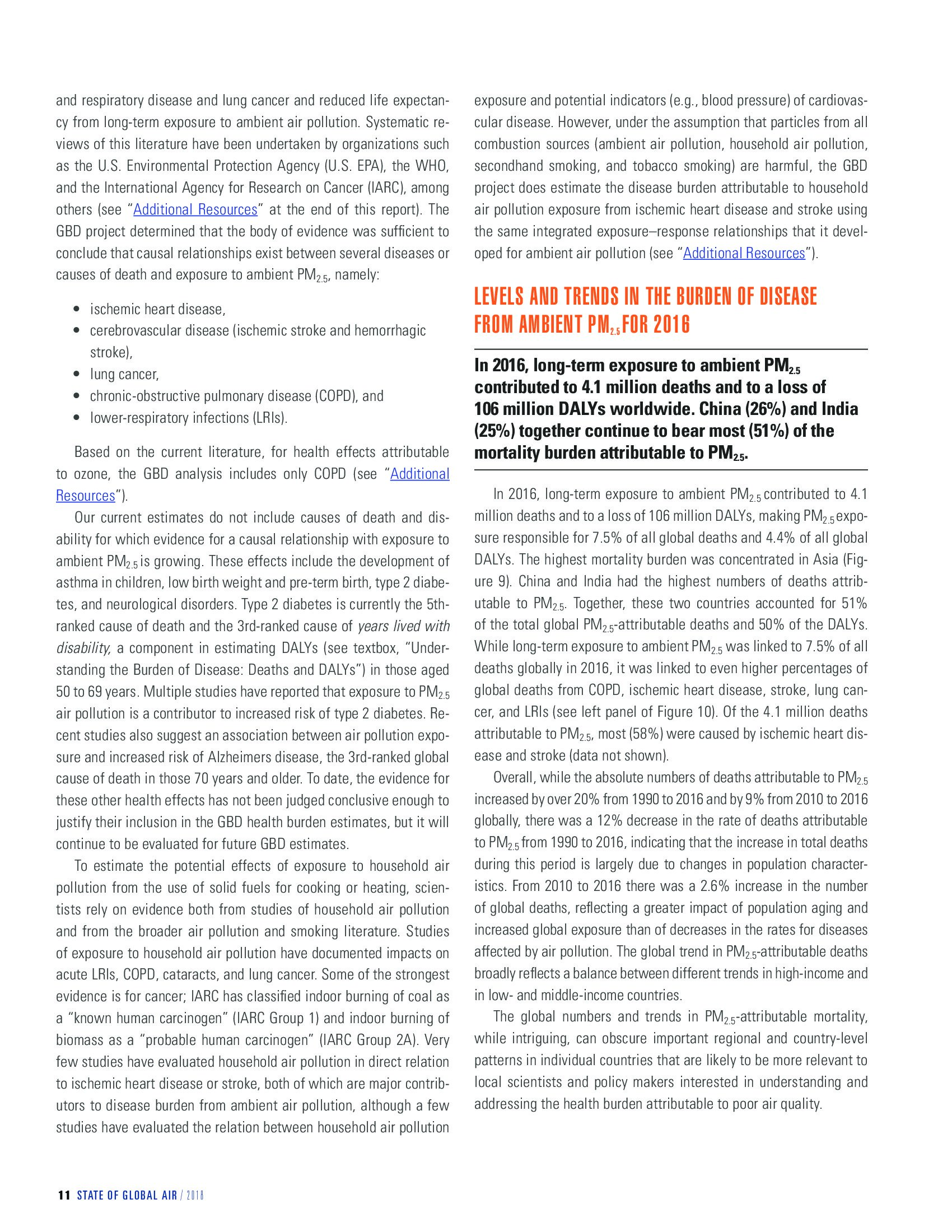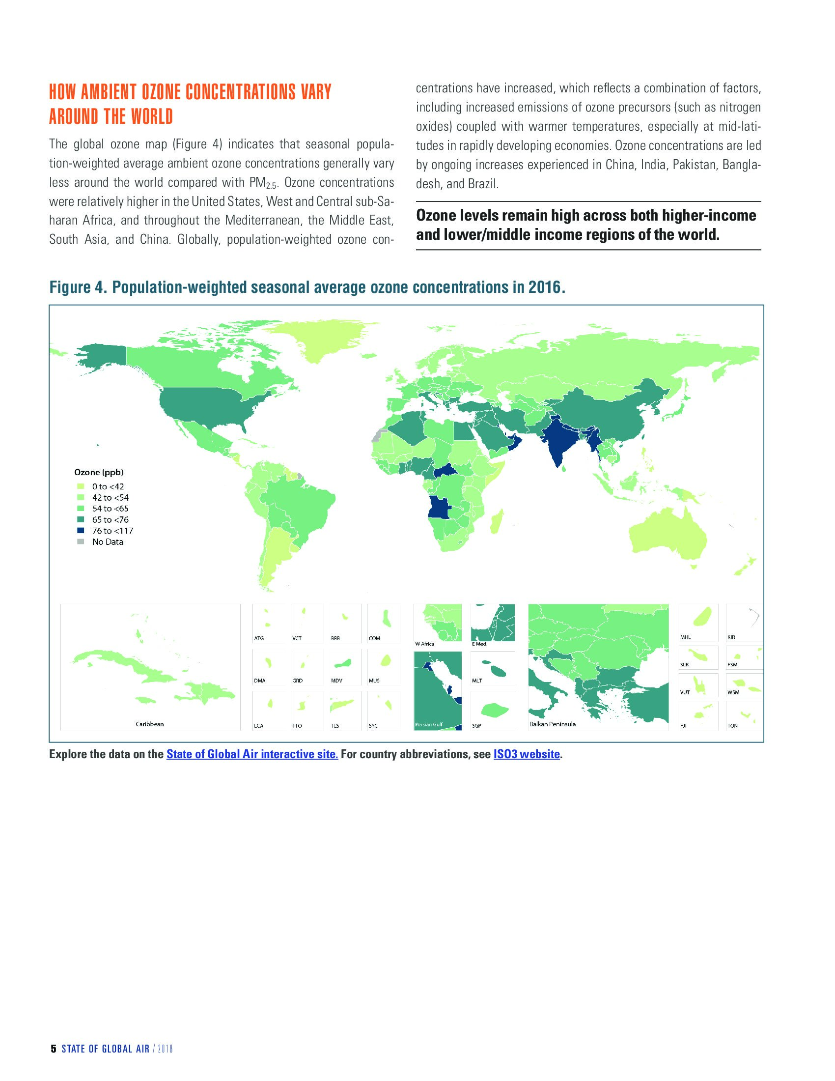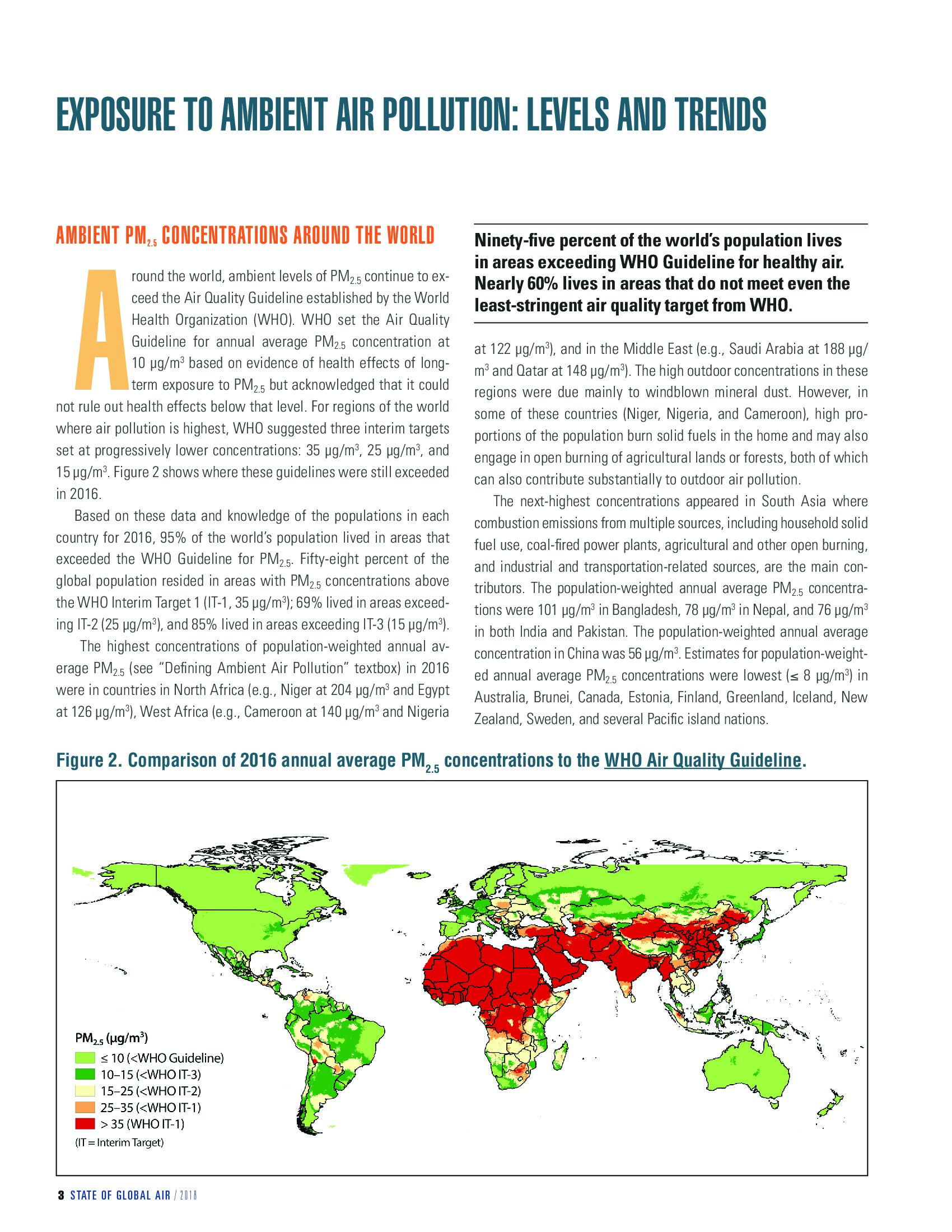 和去年一样,该报告提供了全球室外空气污染的最新情况。最新的GBD(全球疾病负担)分析继续将空气污染确定为导致死亡和残疾的最重要风险因素之一。环境颗粒物(PM2.5)是空气污染的一个组成部分,被列为早亡的第六大风险因素。全球范围内接触PM2.5导致2016年410万人死于心脏病、卒中、肺癌、慢性肺病和呼吸道感染。与其他更为人所知的风险相比,PM2.5造成的死亡人数比酒精、不活动或高钠摄入等已知风险因素更多。臭氧是室外空气污染的另一重要组成部分,其水平在世界各地呈上升趋势,造成234,000人死于慢性肺病。