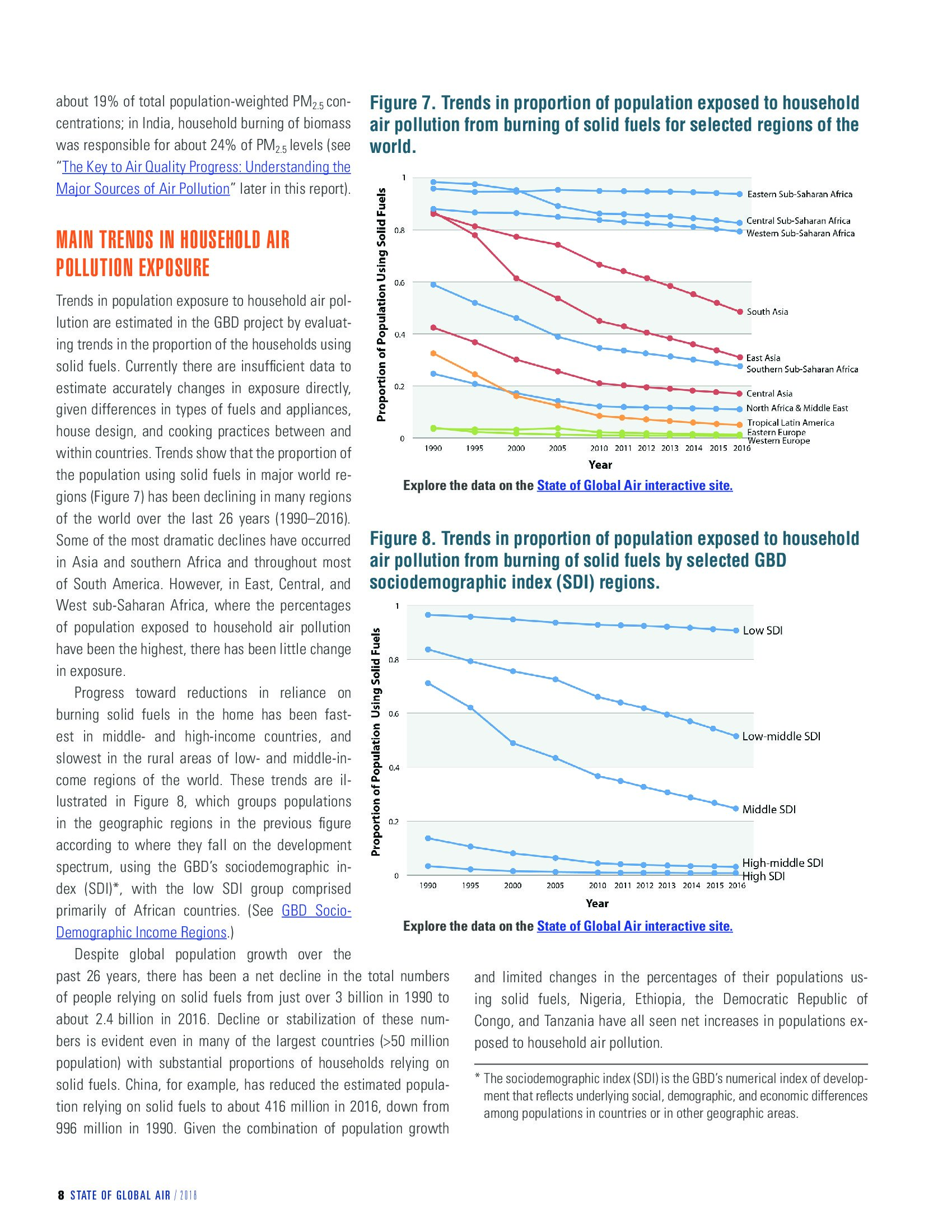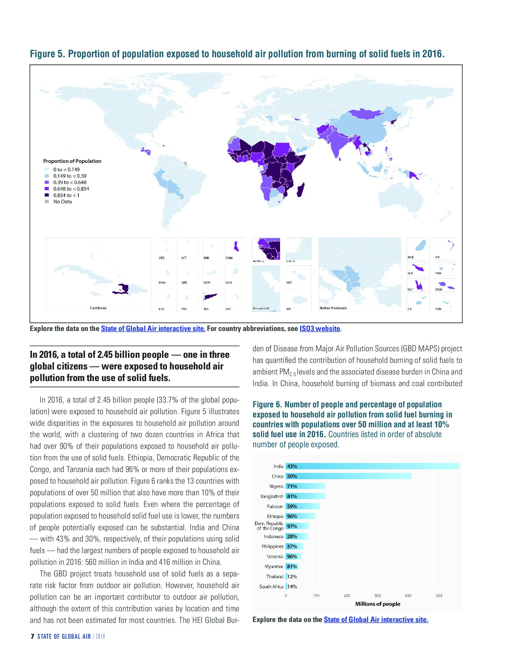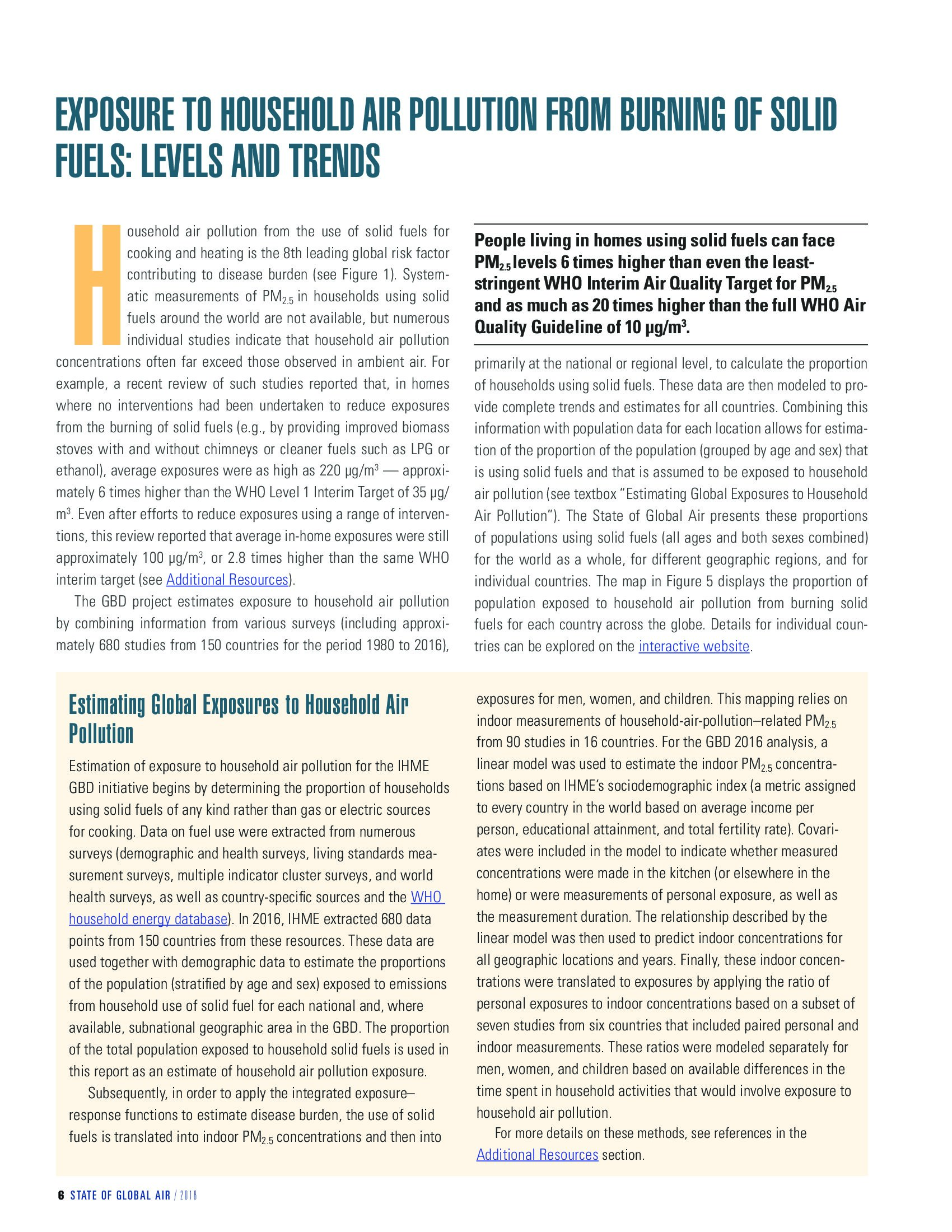 GBD记录了全球数百万人因使用固体燃料(例如煤、木头和粪便)烹饪和取暖所造成的家庭空气污染。2016的数据显示,暴露于“家庭空气污染”也会对健康产生重大影响,在早亡的危险因素中排名第8,2016年导致260万人死亡。2016年全球有24.5亿人暴漏在家庭空气污染之下,相当于1/3的世界人口。