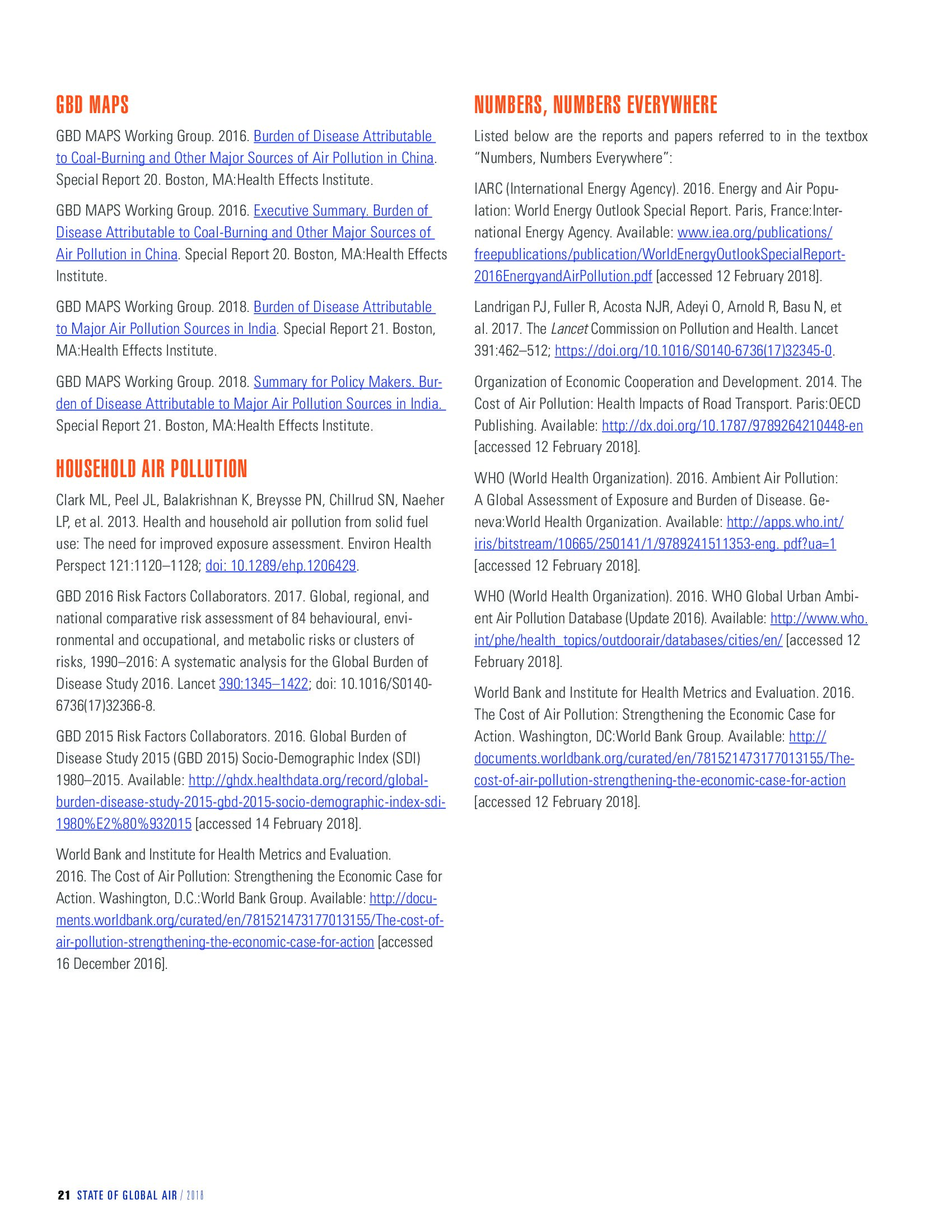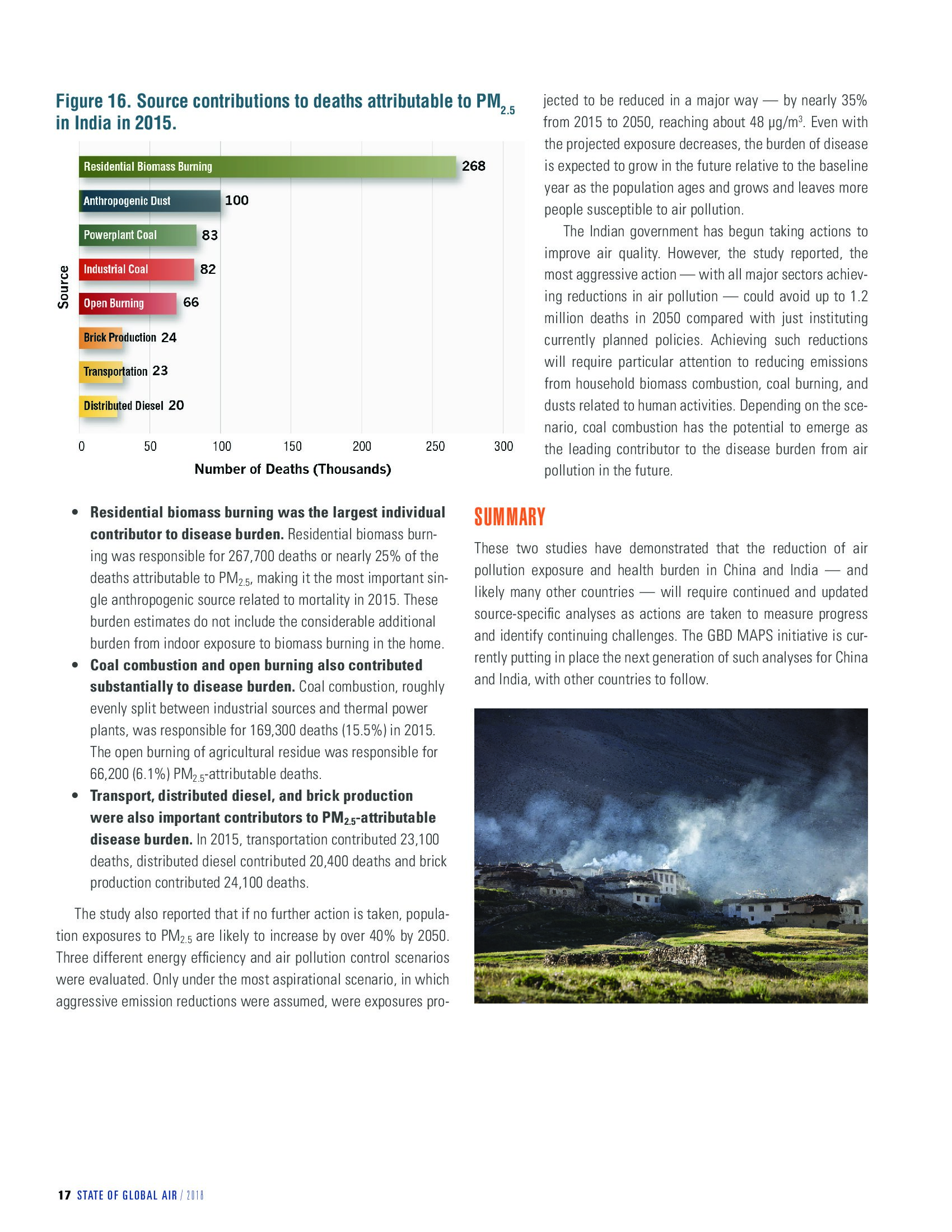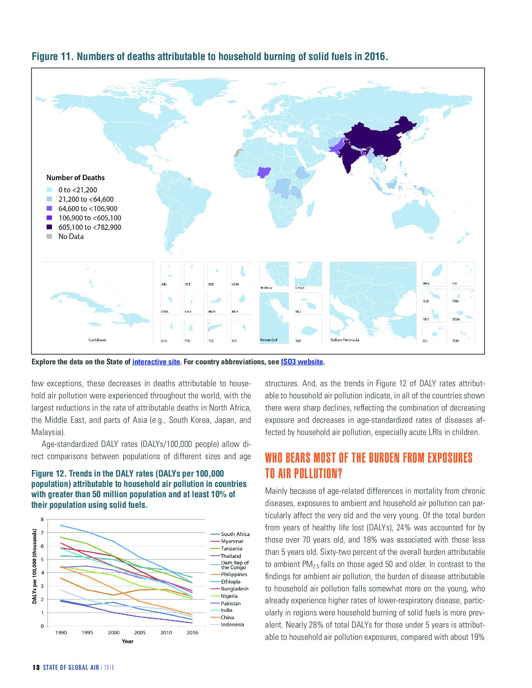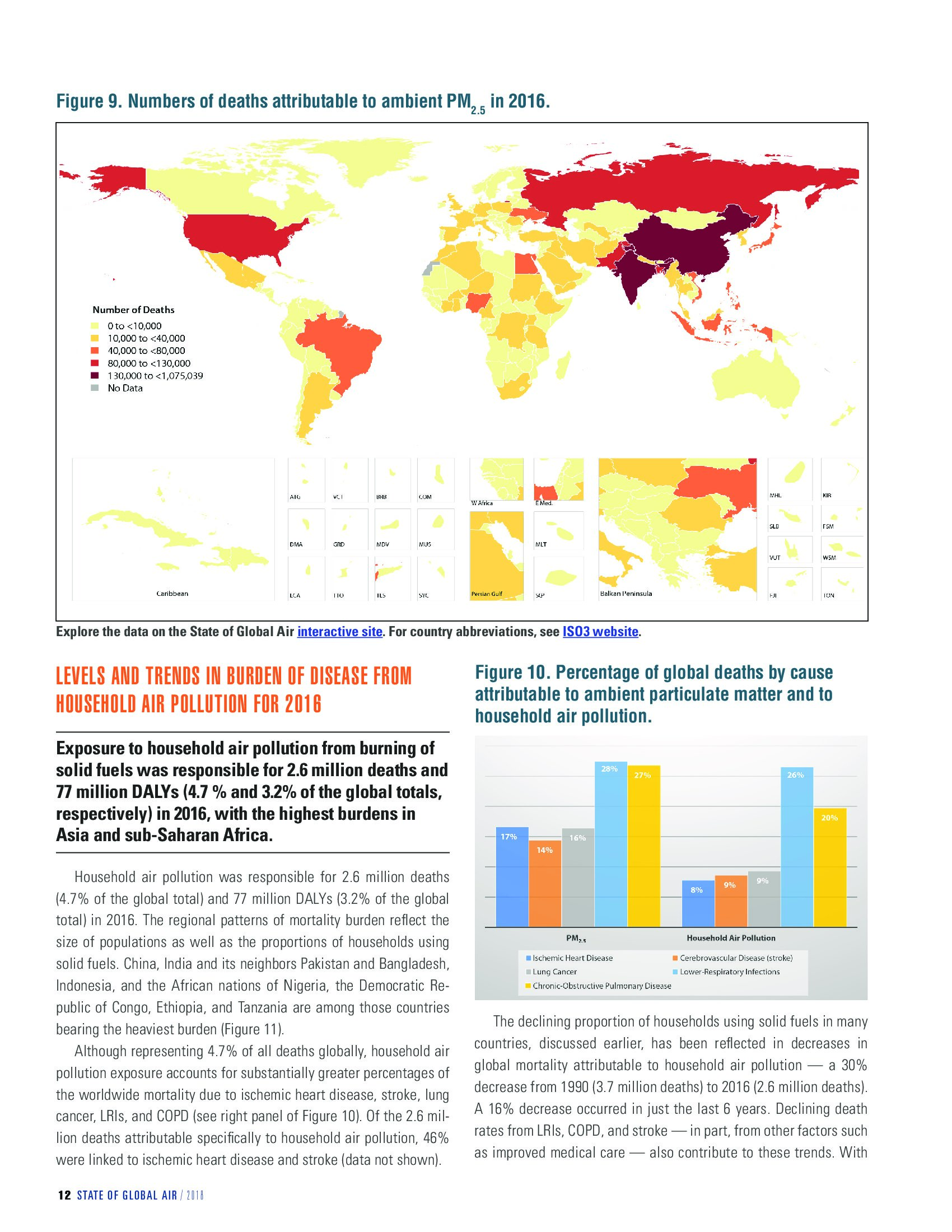 GBD记录了全球数百万人因使用固体燃料(例如煤、木头和粪便)烹饪和取暖所造成的家庭空气污染。2016的数据显示,暴露于“家庭空气污染”也会对健康产生重大影响,在早亡的危险因素中排名第8,2016年导致260万人死亡。2016年全球有24.5亿人暴漏在家庭空气污染之下,相当于1/3的世界人口。